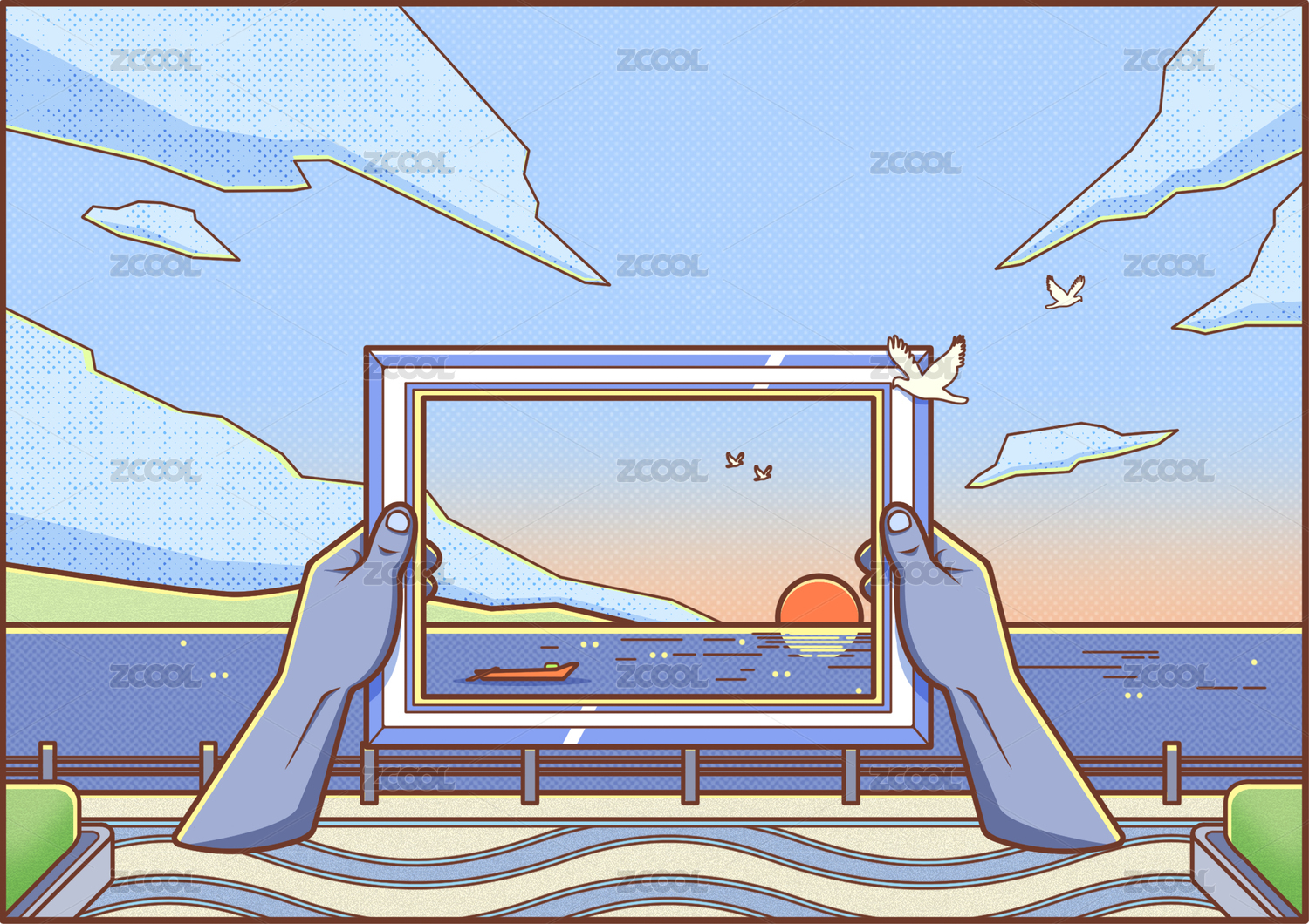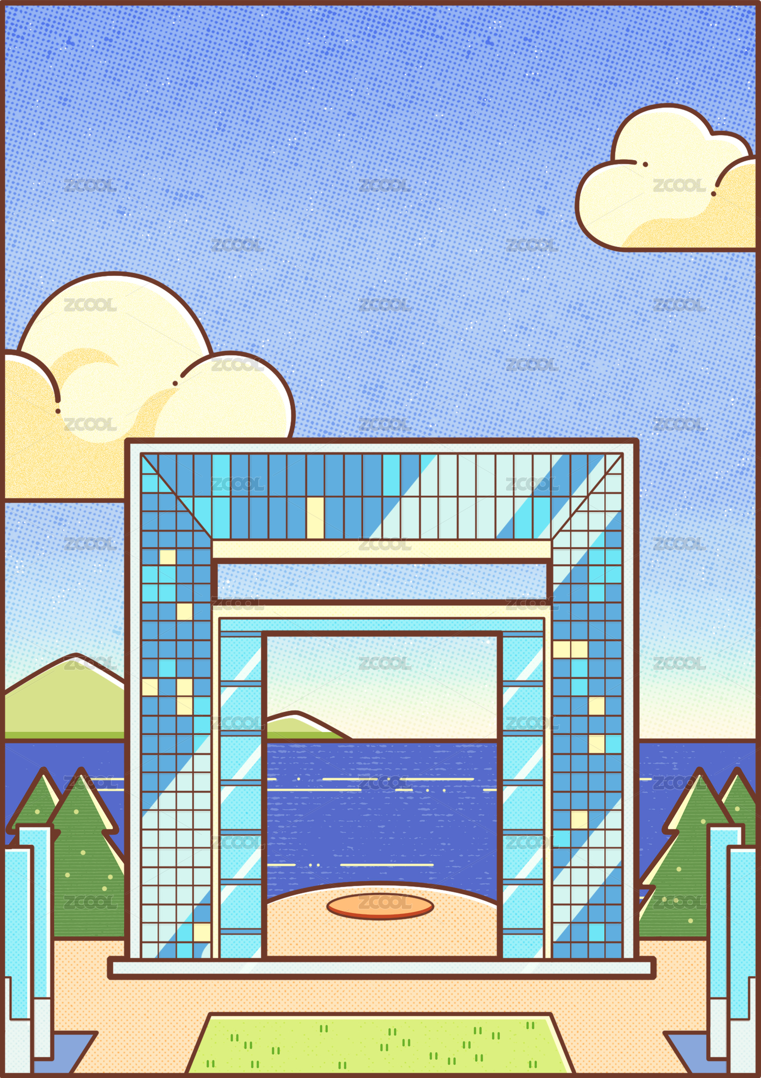 威海城市旅游風(fēng)景插畫之大相框雕塑