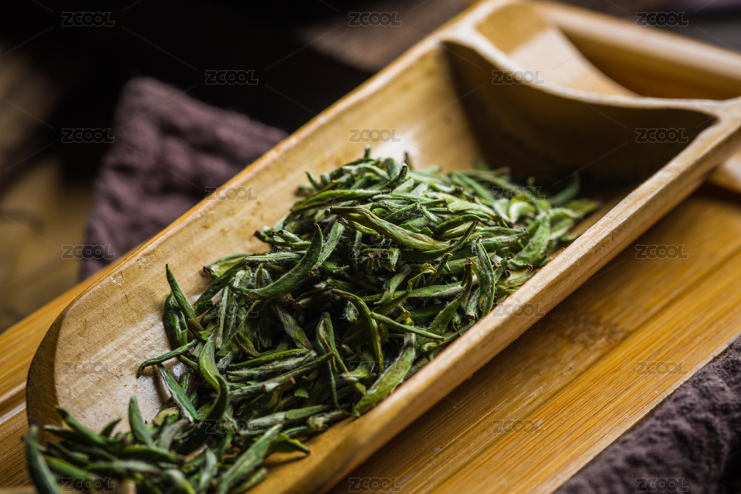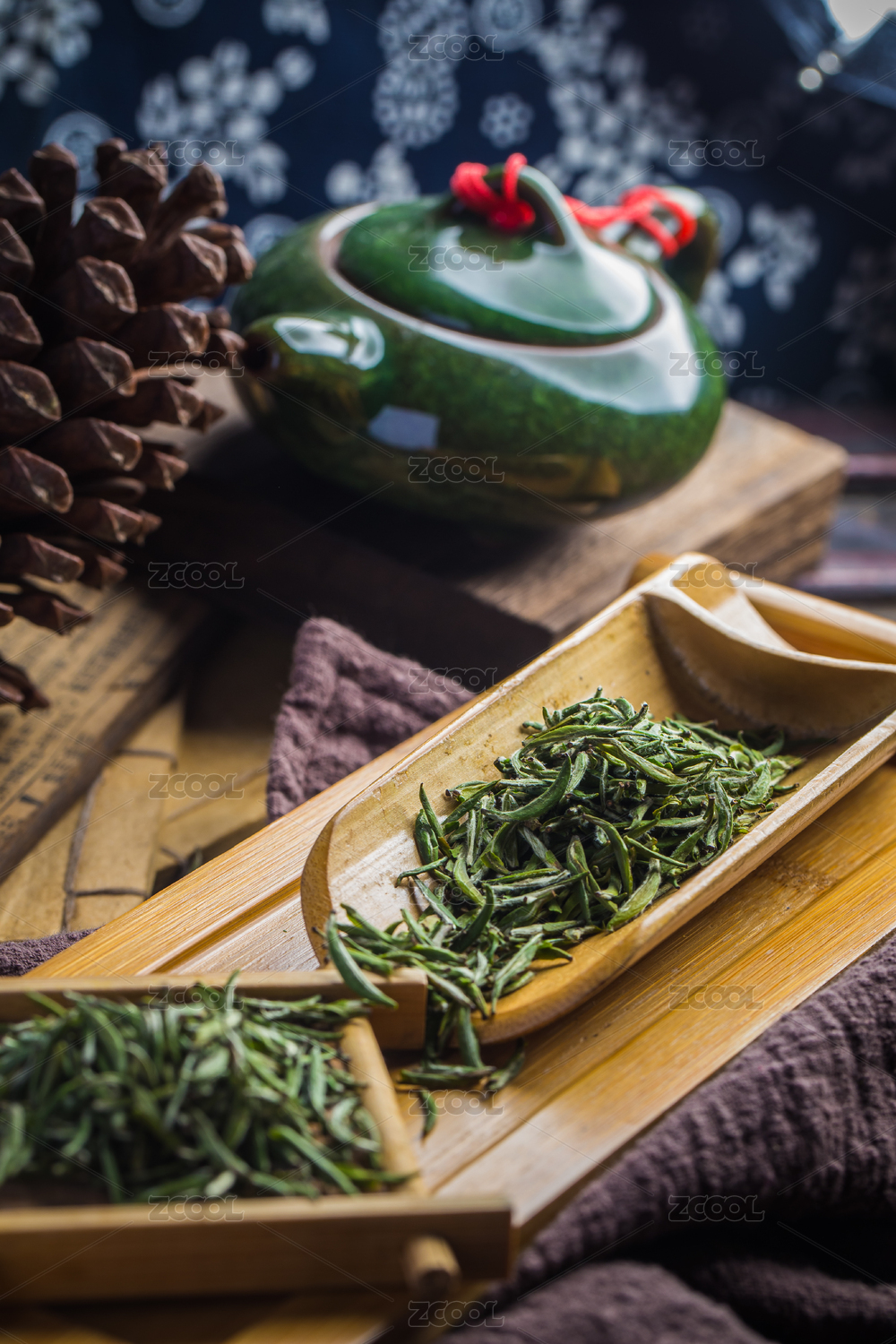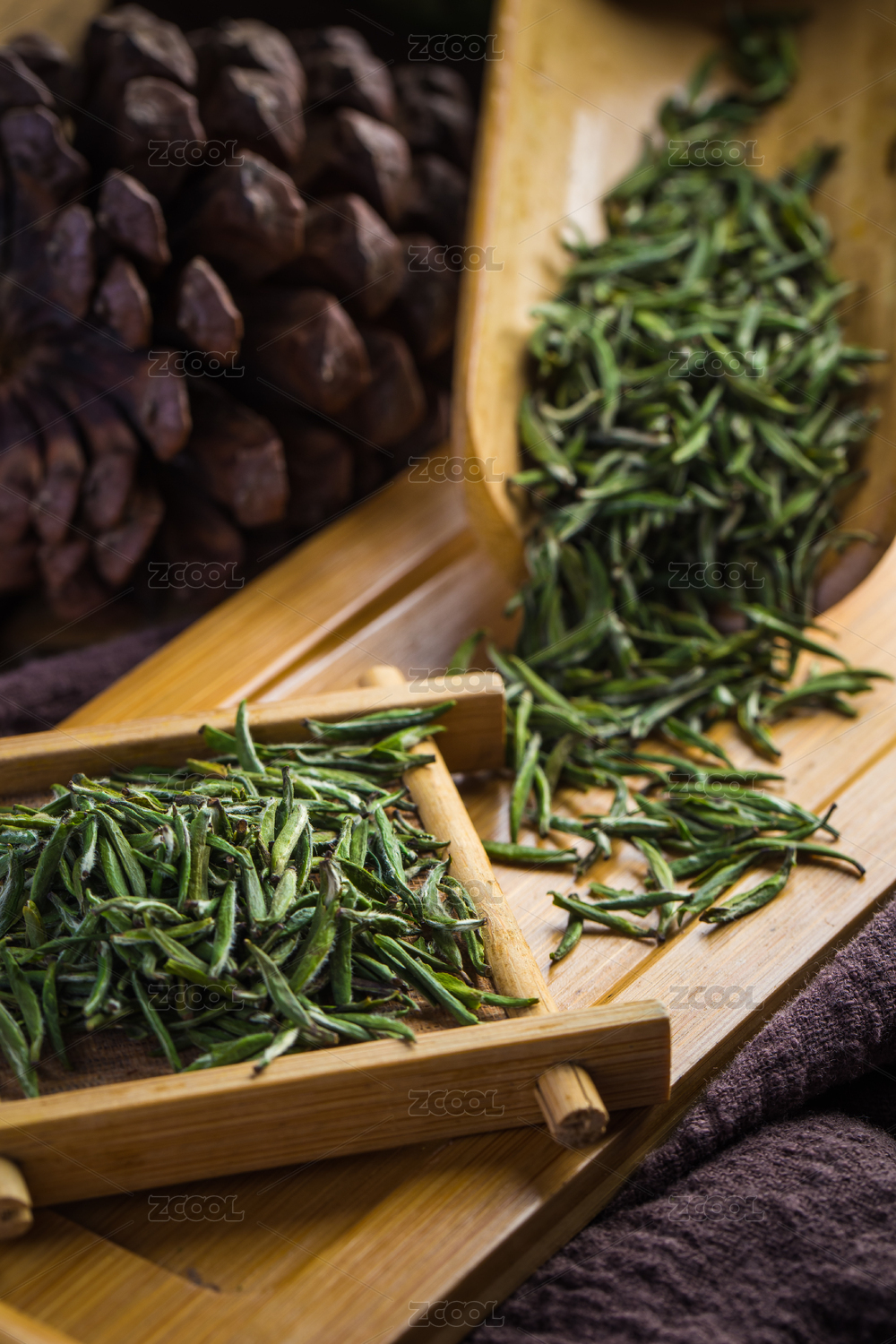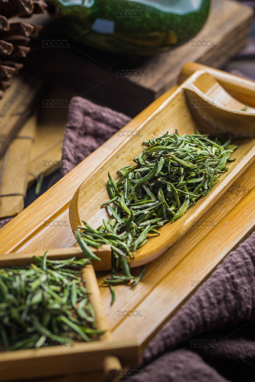 放在方形和扁形容器里的土特產(chǎn)茶葉翠芽