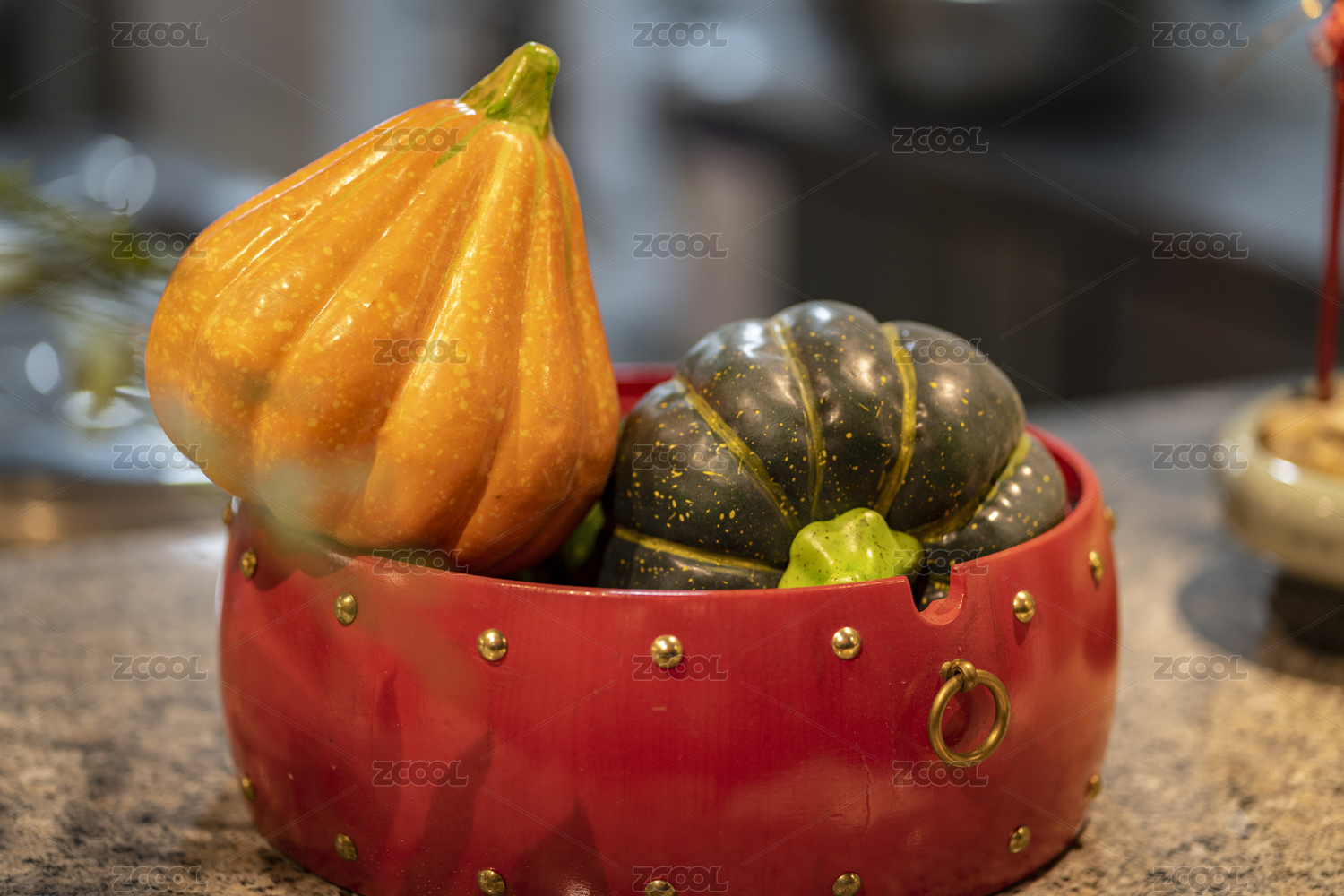 紅色鼓形容器里盛裝的兩個(gè)紅綠南瓜