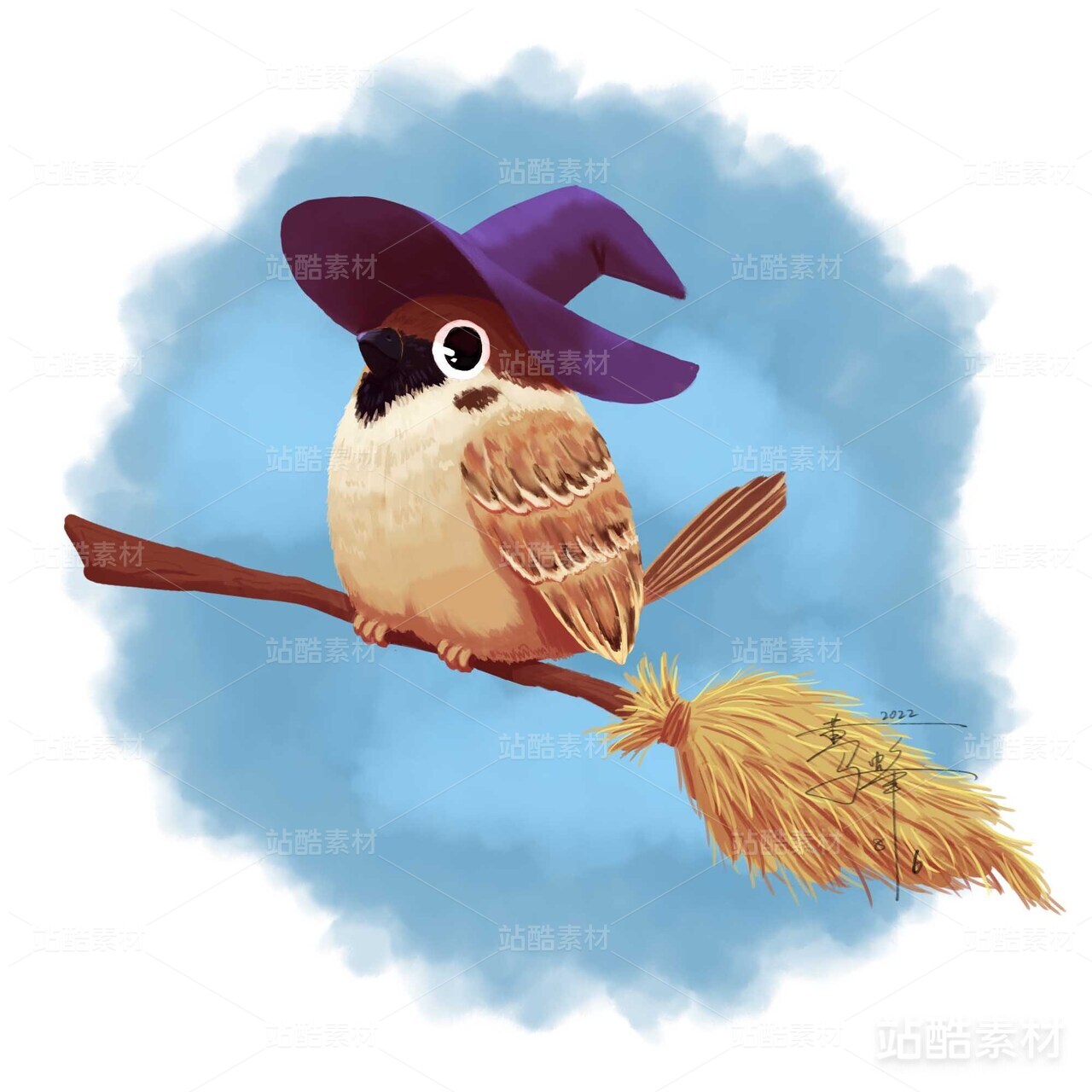 紫黃日系萬圣節(jié)女巫騎著掃帚