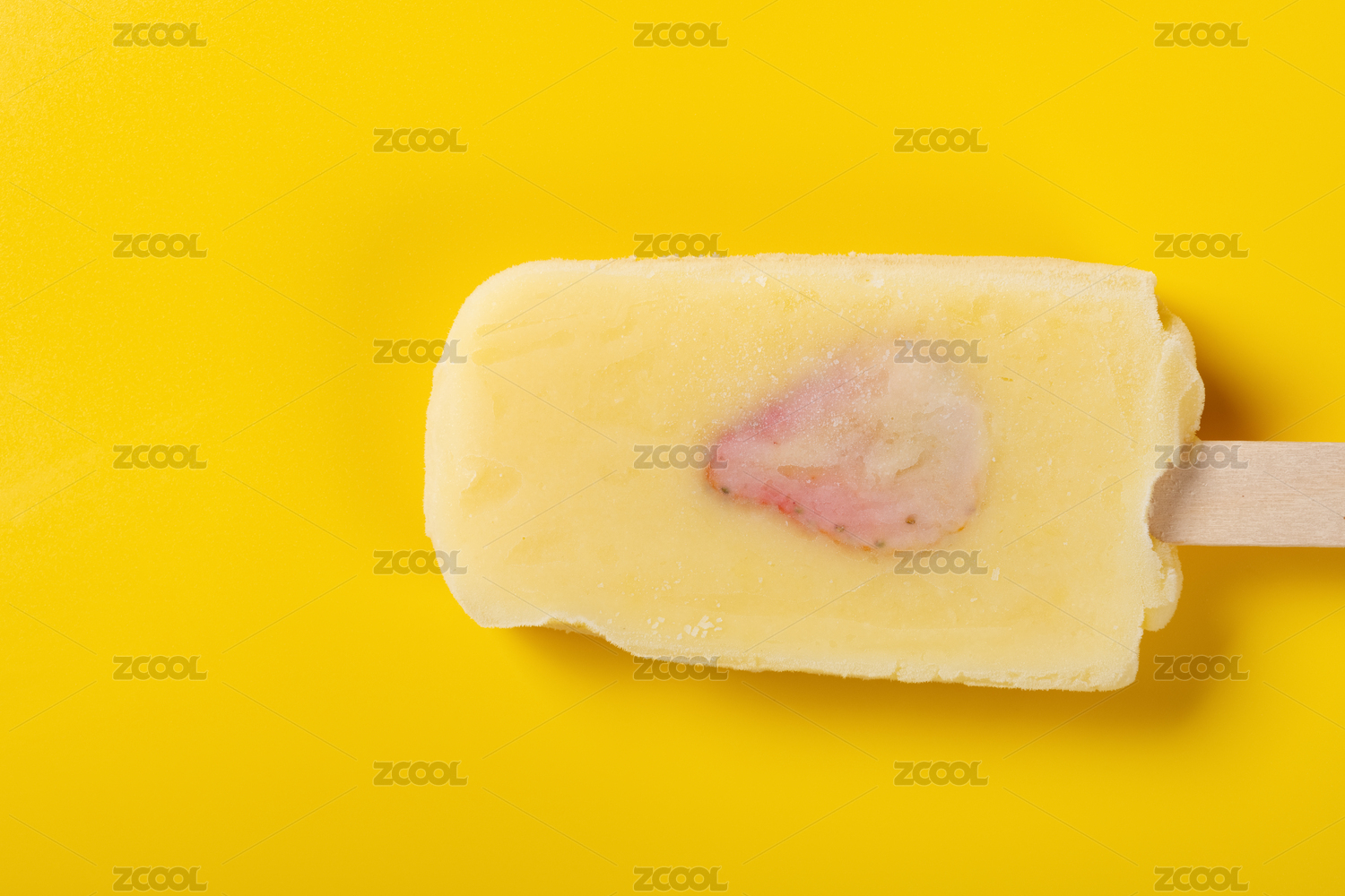fresh durian flavor popsicle with slice of strawberry on a yellow background