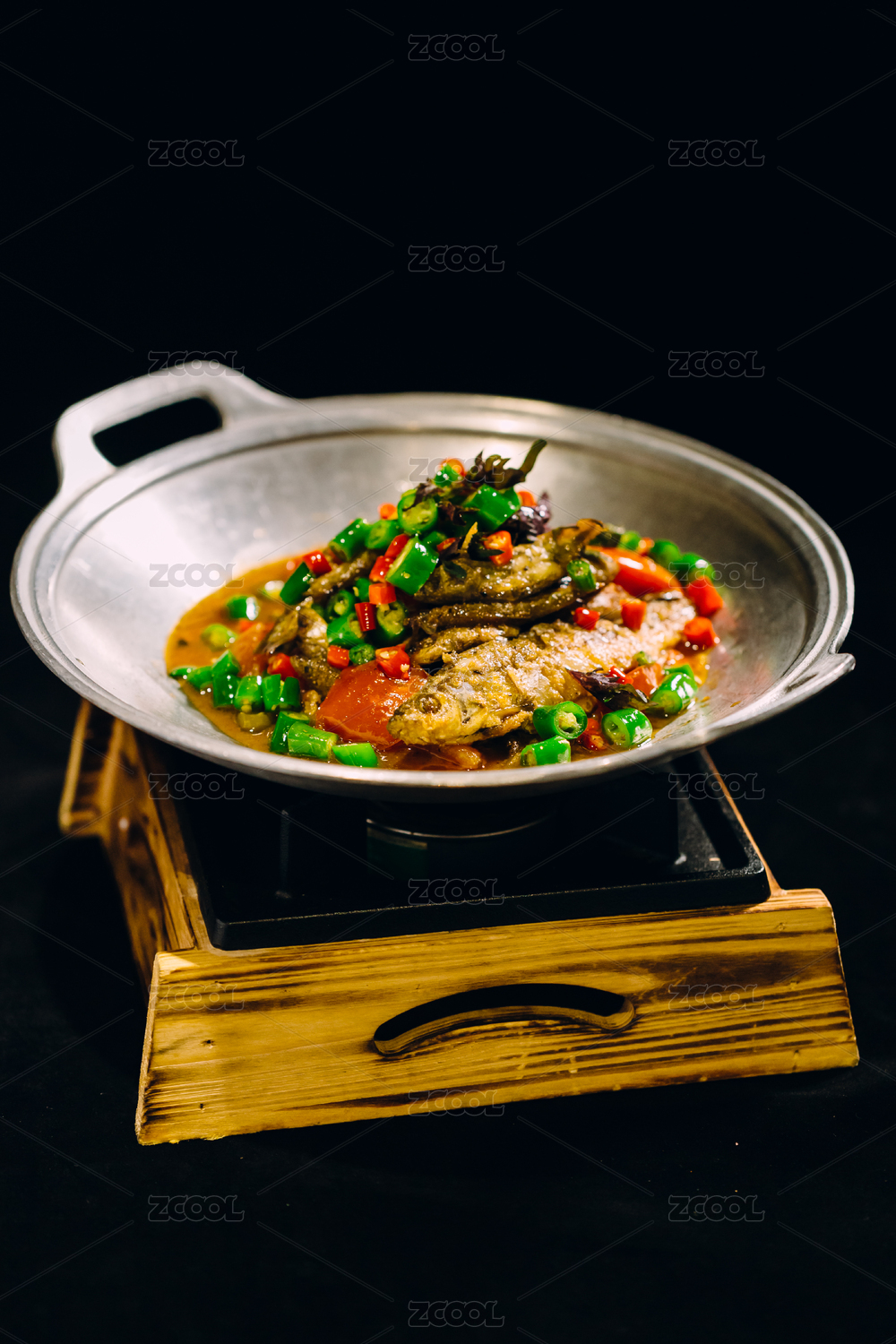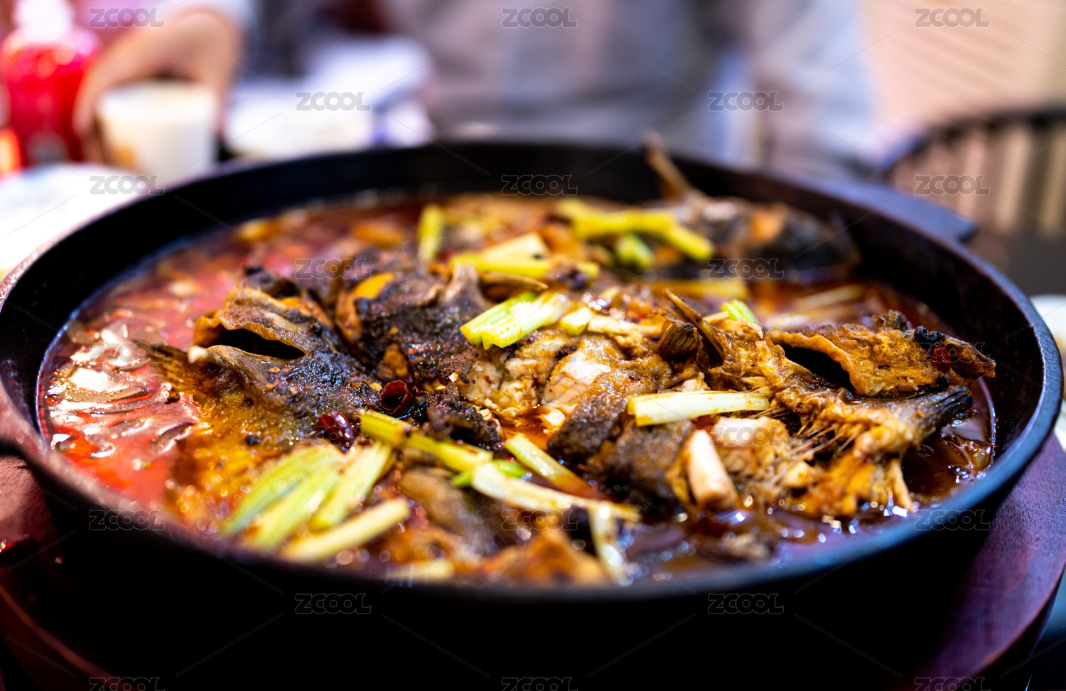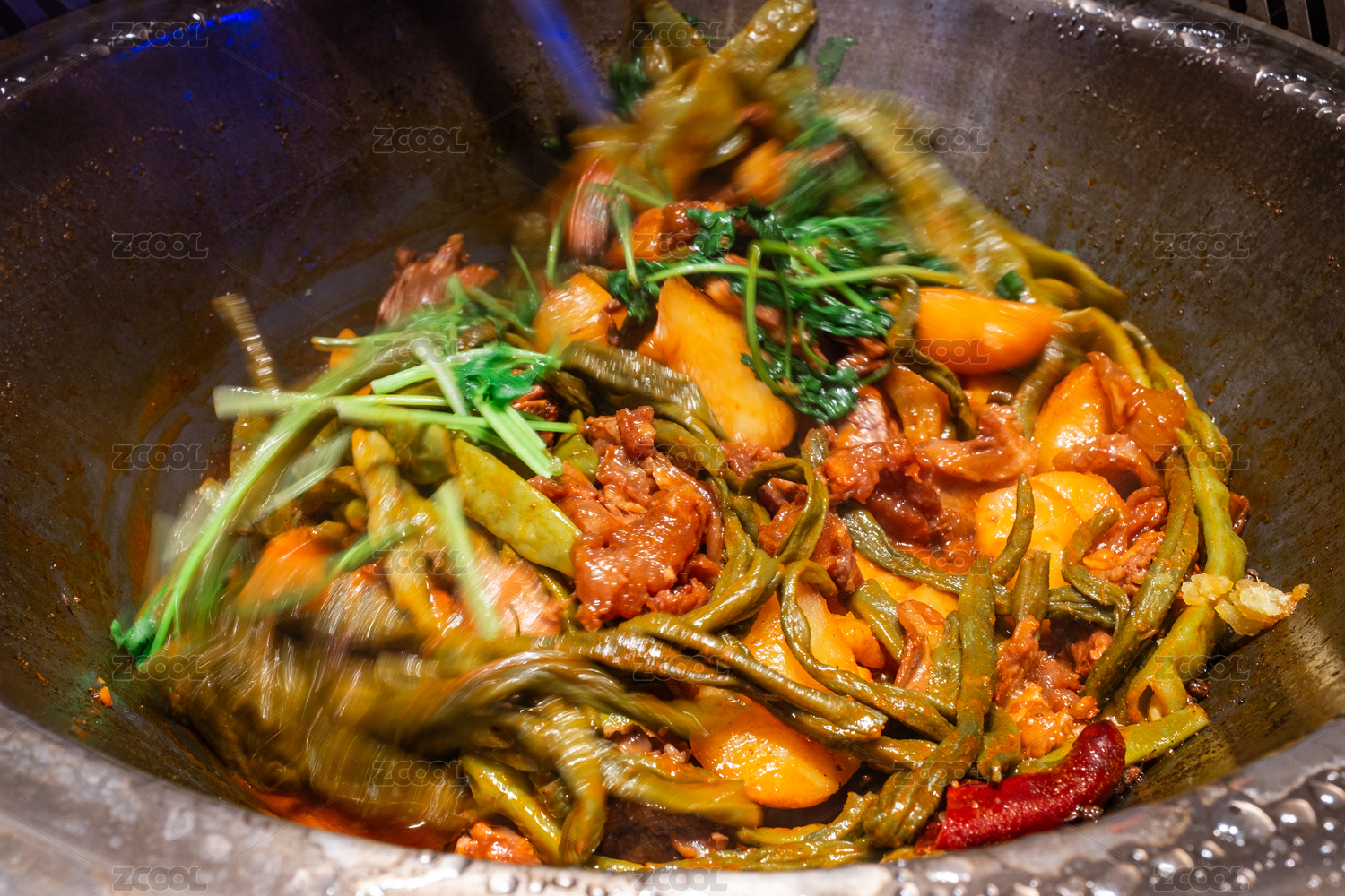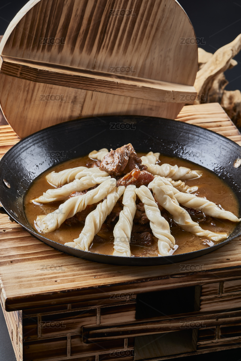 精美餐具裝的鐵鍋燉柴雞塊配面花卷棍兒