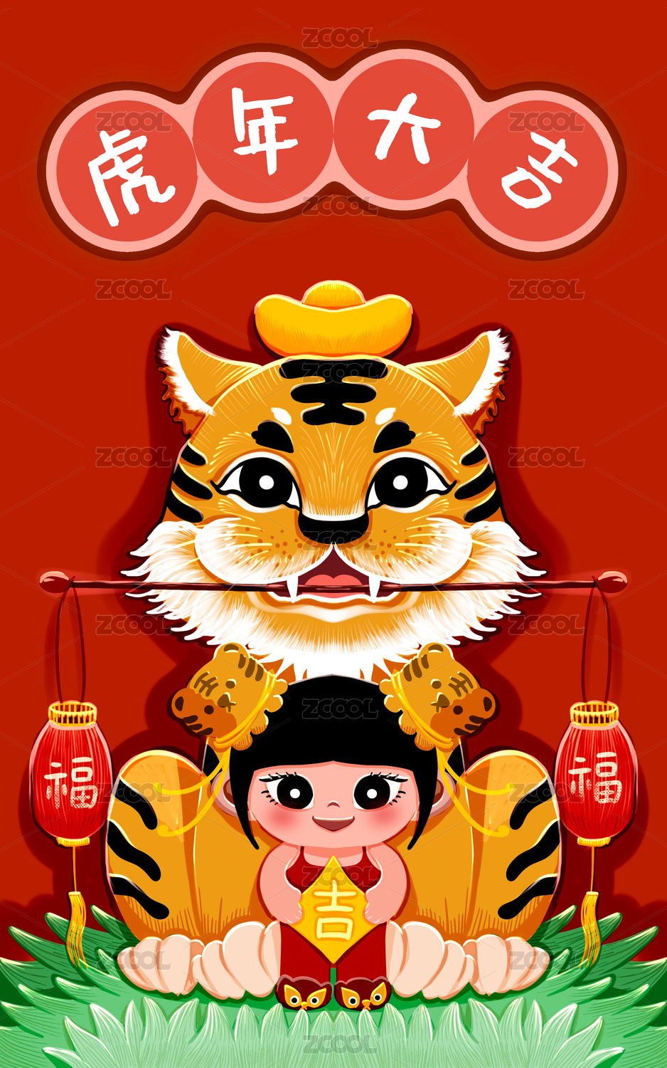 虎年新春老虎中國(guó)娃娃系列之虎年大吉插畫