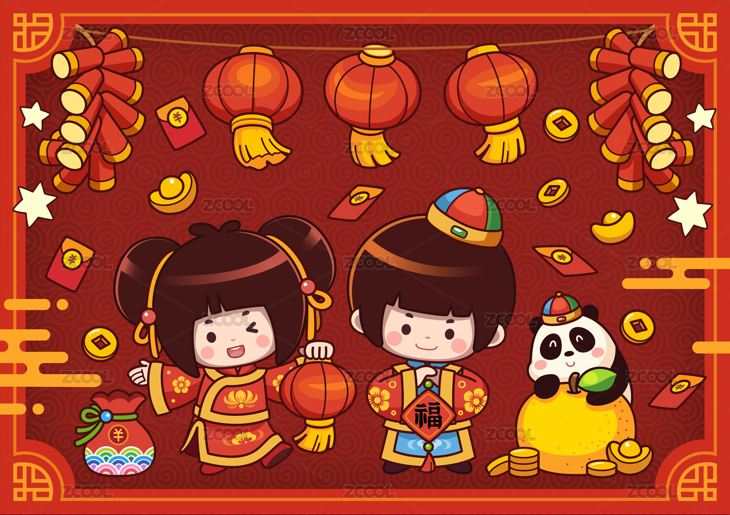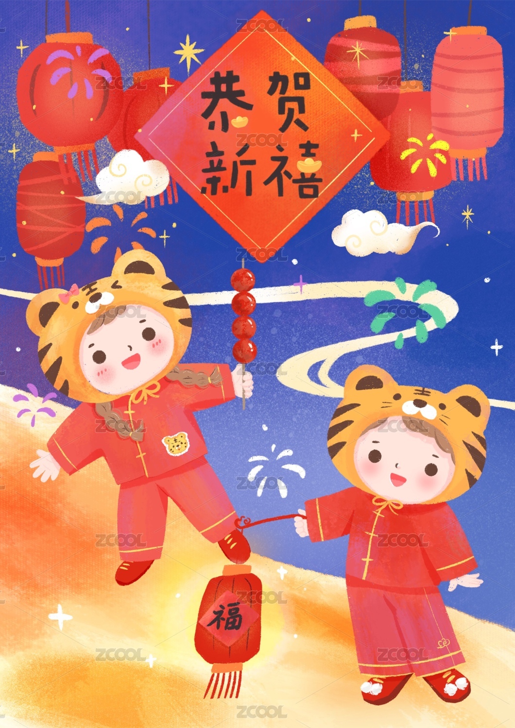 虎年賀圖可愛中國(guó)娃娃元宵節(jié)