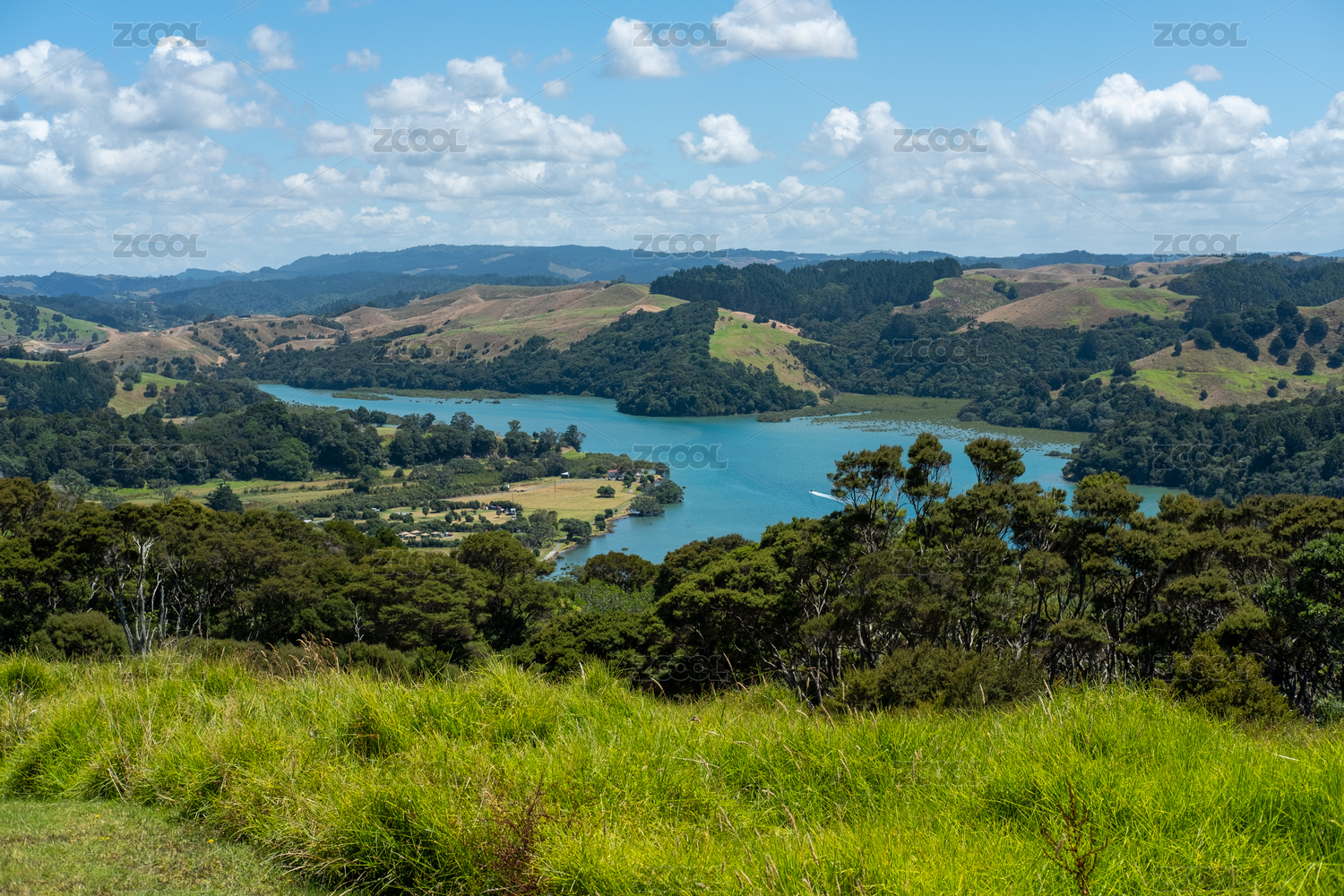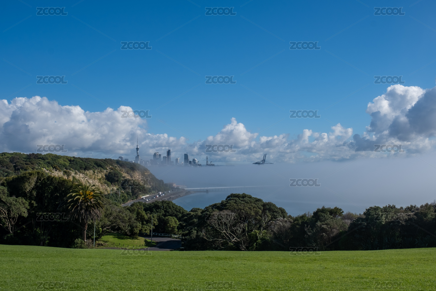 藍天白云下的草地大海以及云霧中的奧克蘭城