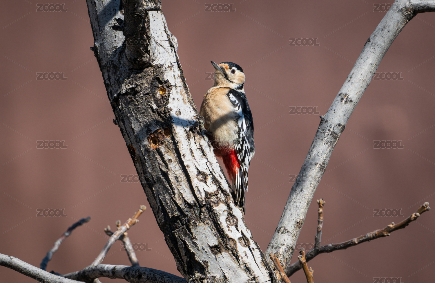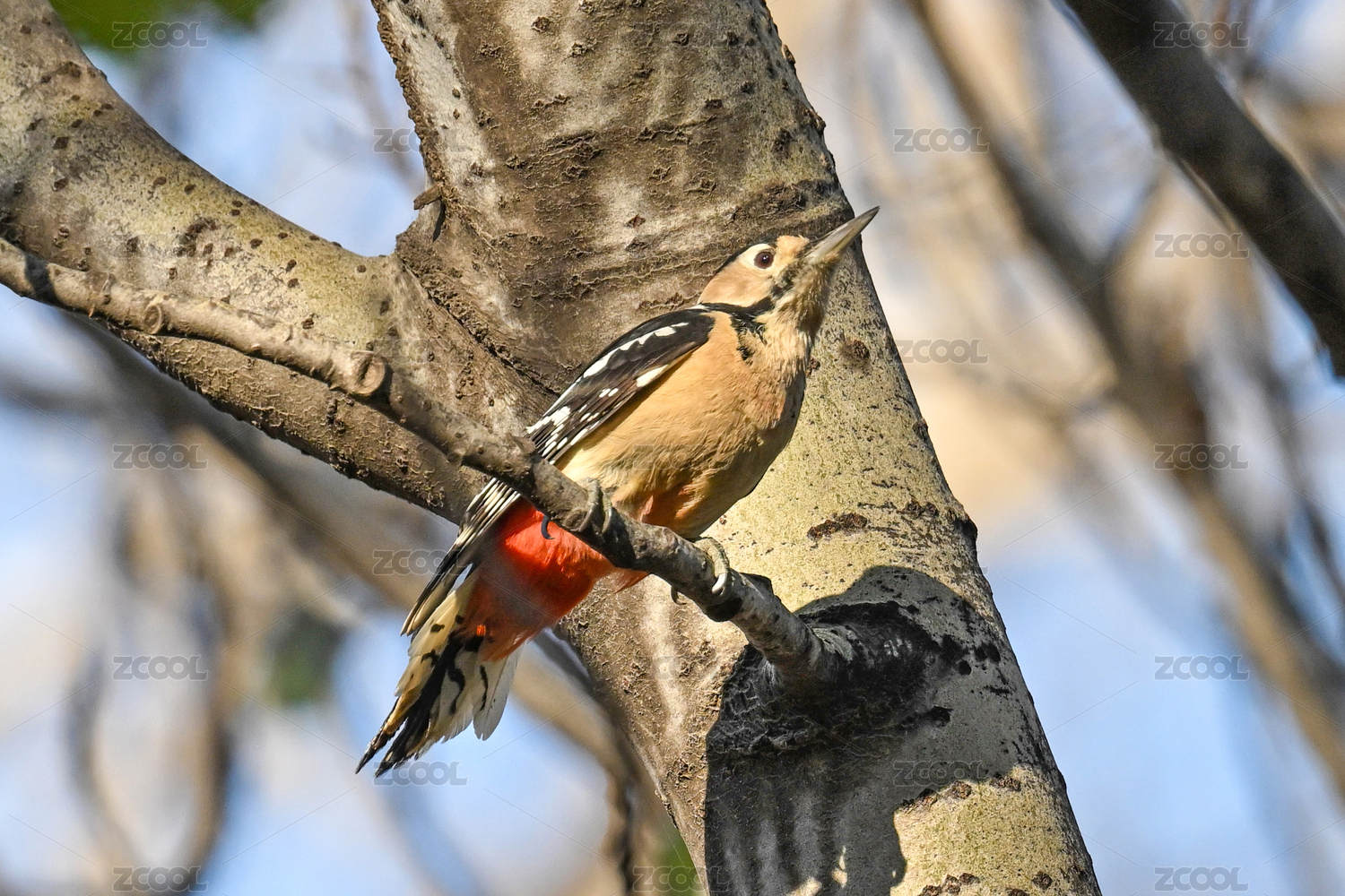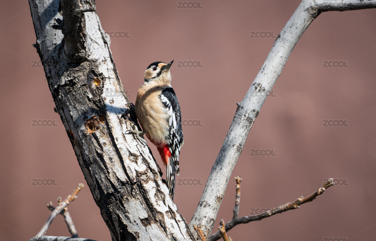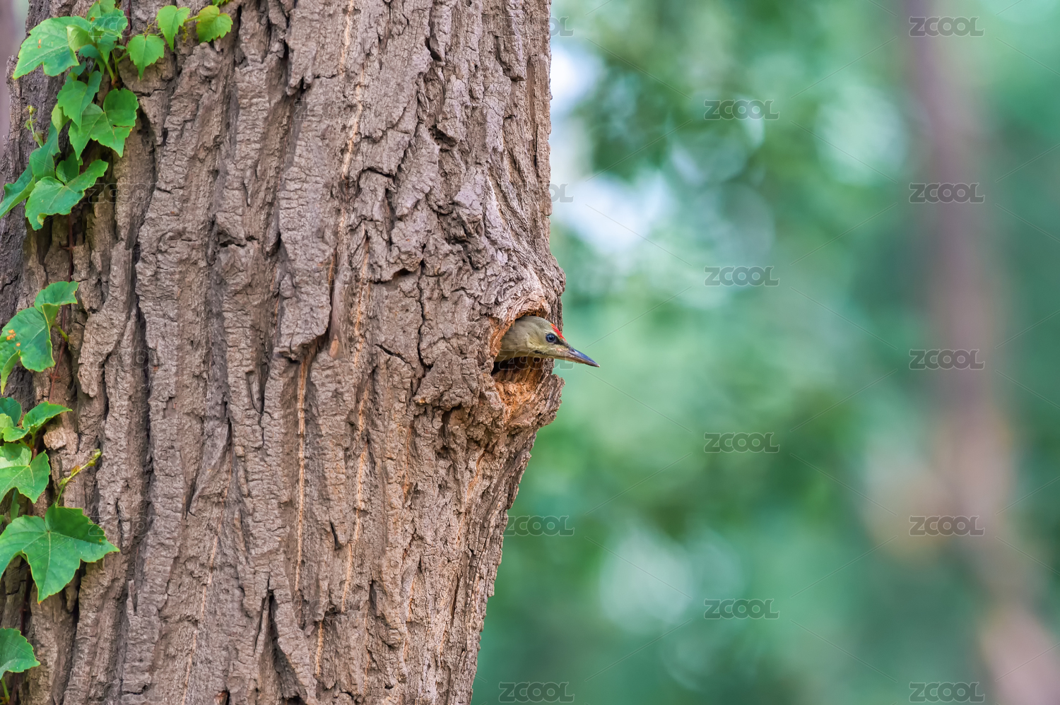一只成年啄木鳥在喂養(yǎng)樹洞里的雛鳥