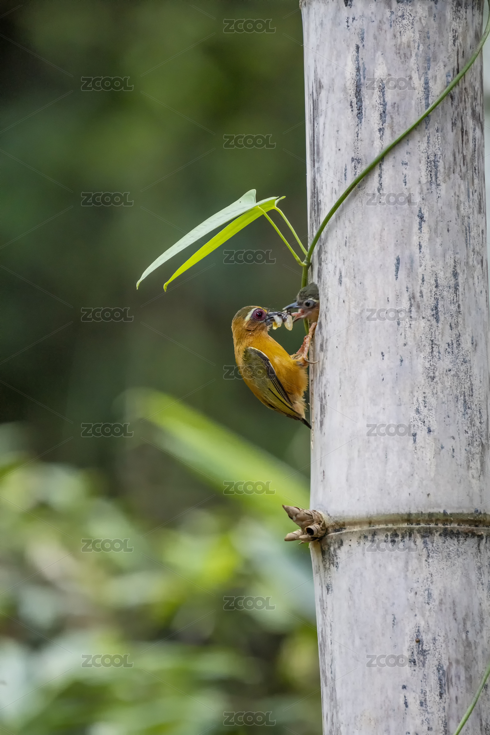 白眉棕啄木鳥在給窩里的雛鳥喂食