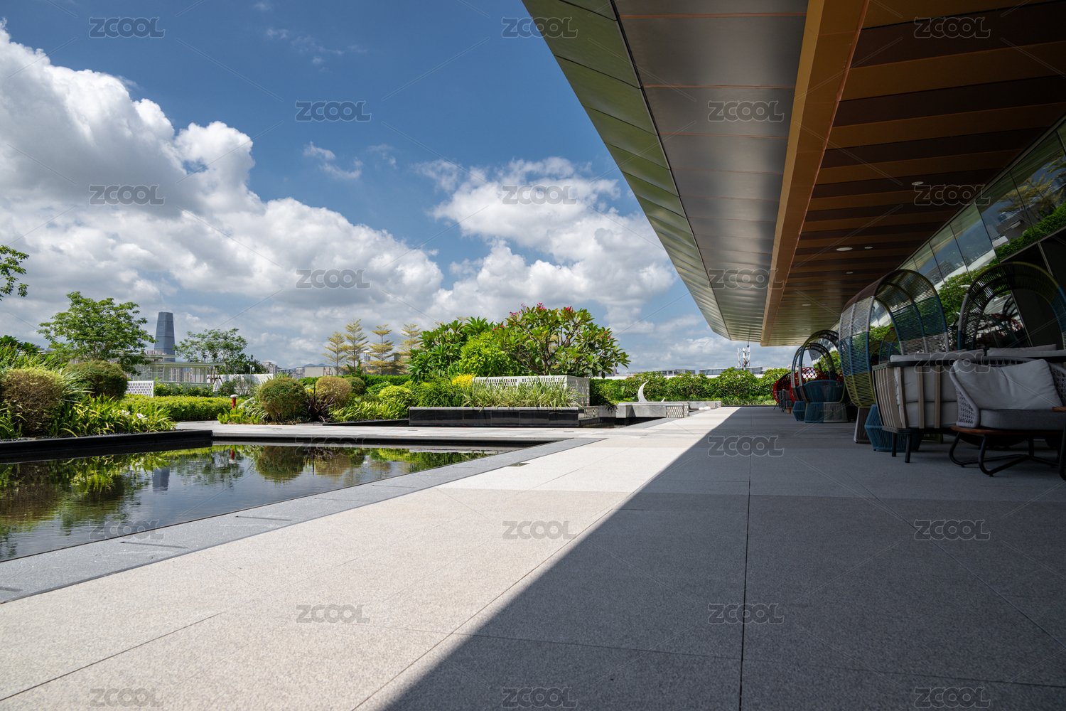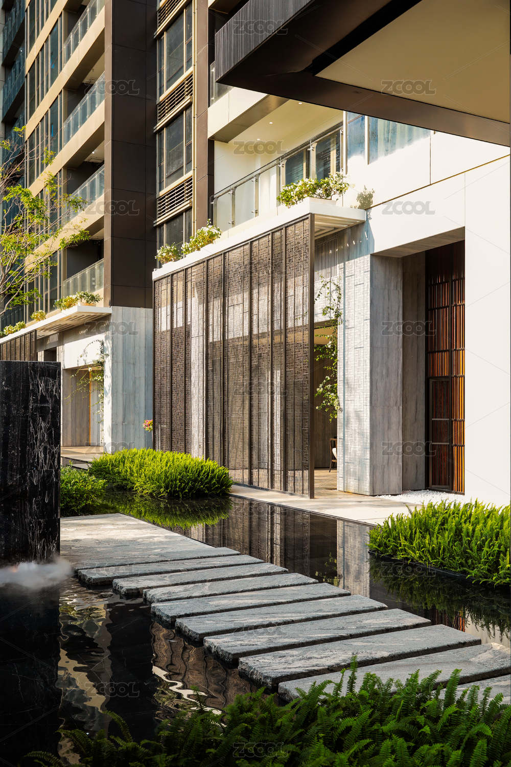 現(xiàn)代建筑旁的寧?kù)o水景長(zhǎng)廊