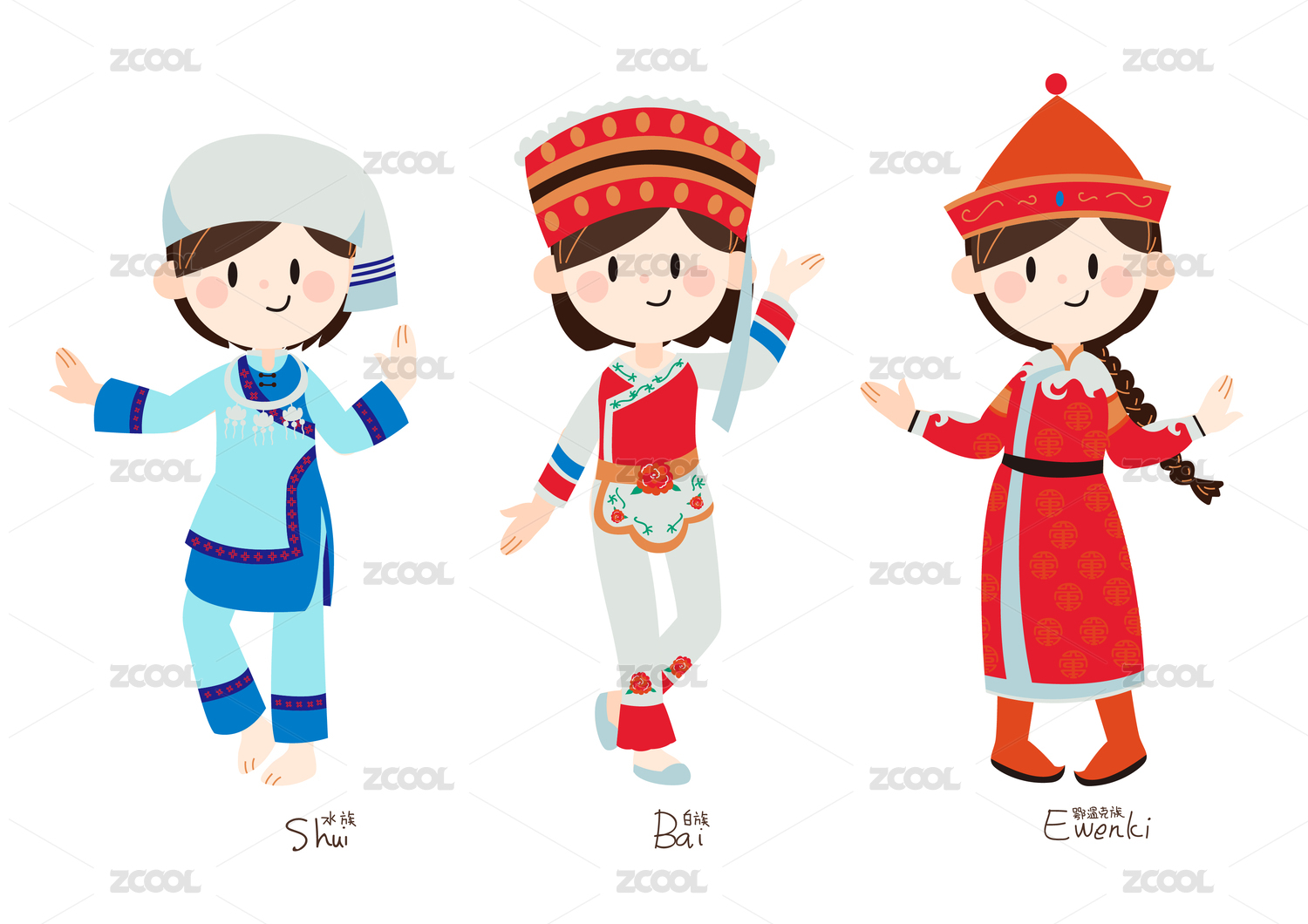 矢量小數(shù)民族服裝女孩水族白族鄂溫克族
