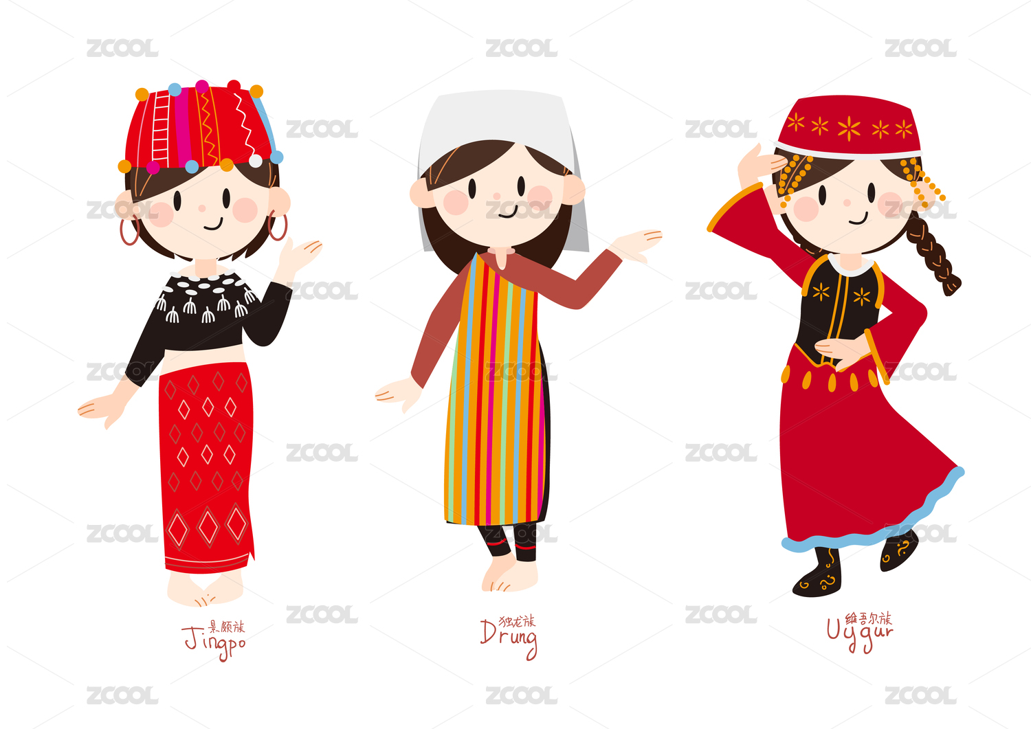 矢量小數(shù)民族服裝女孩景頗族獨(dú)龍族維吾爾族