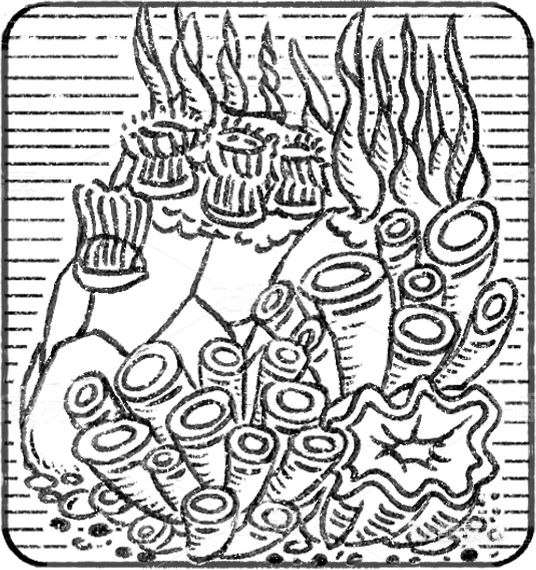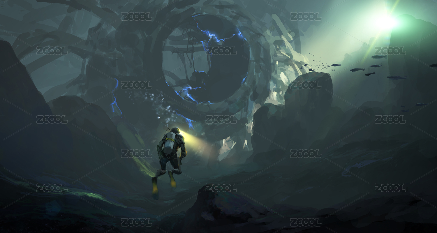 神秘的海底機(jī)器場(chǎng)景設(shè)定,海底世界插畫(huà)。