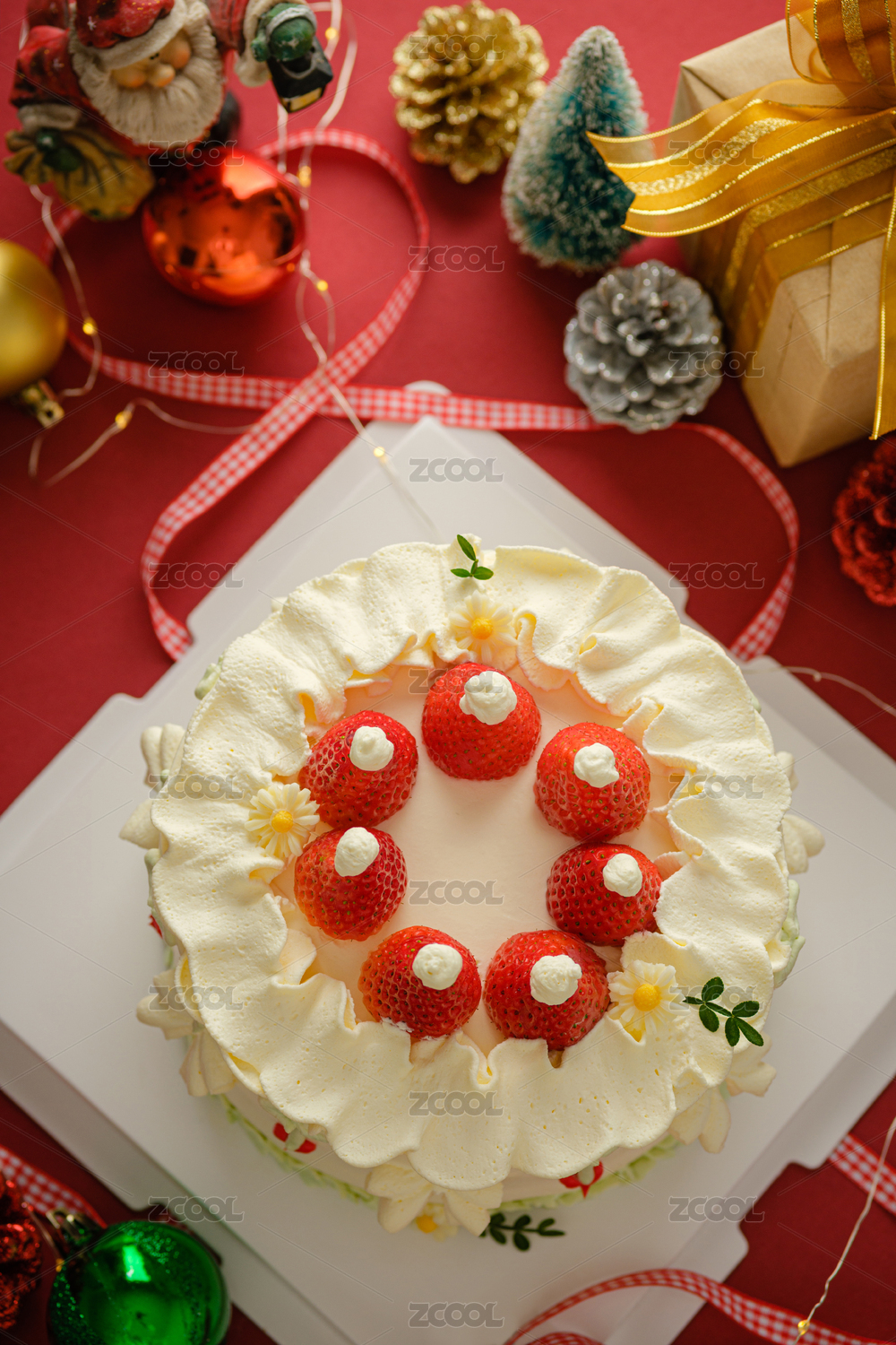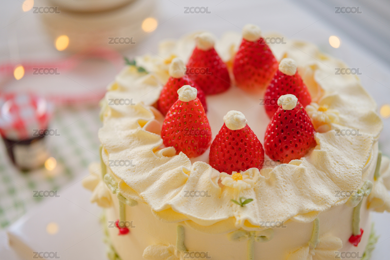 溫暖的室內(nèi)環(huán)境中鋪滿草莓的乳白色生日蛋糕