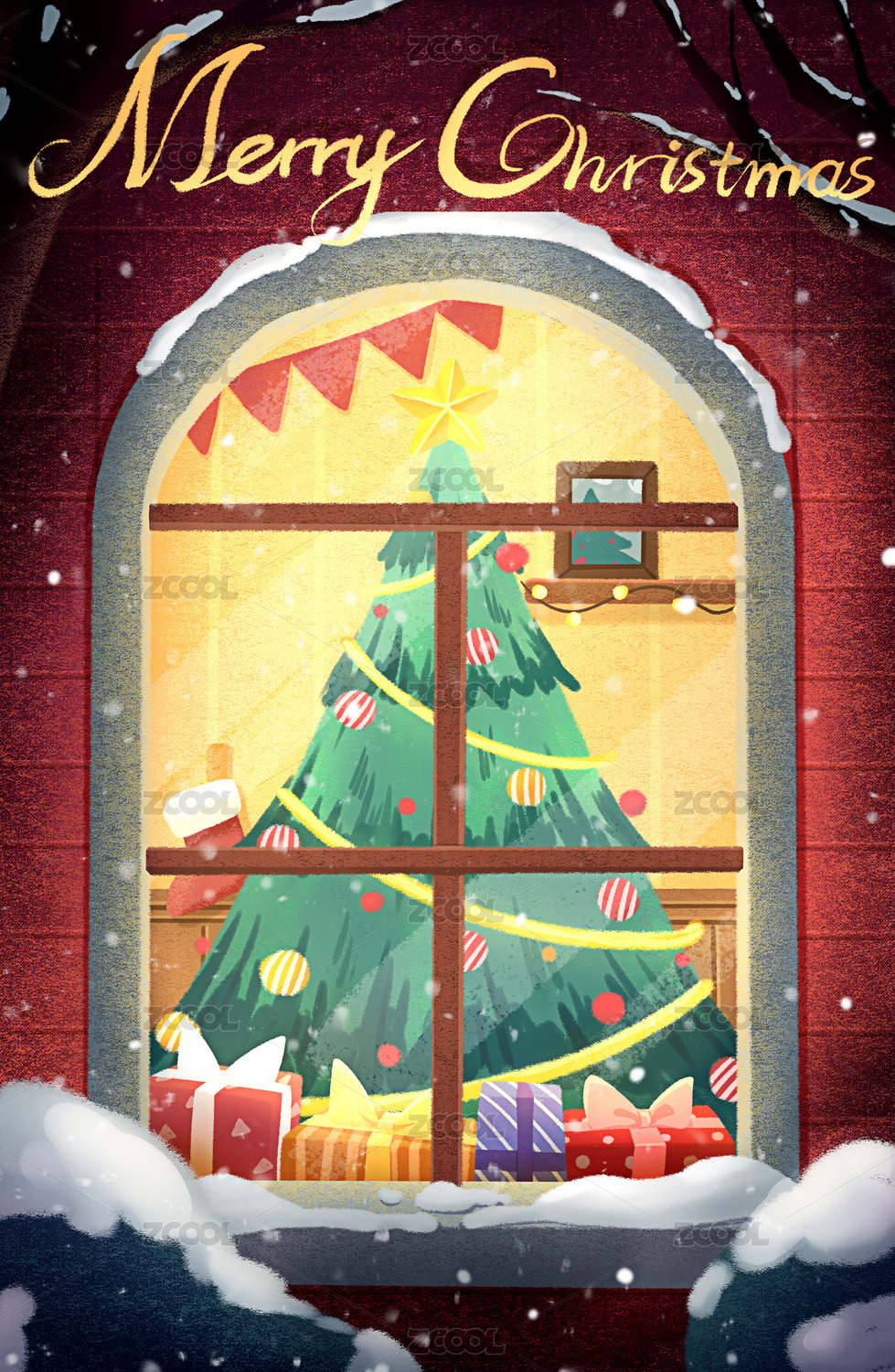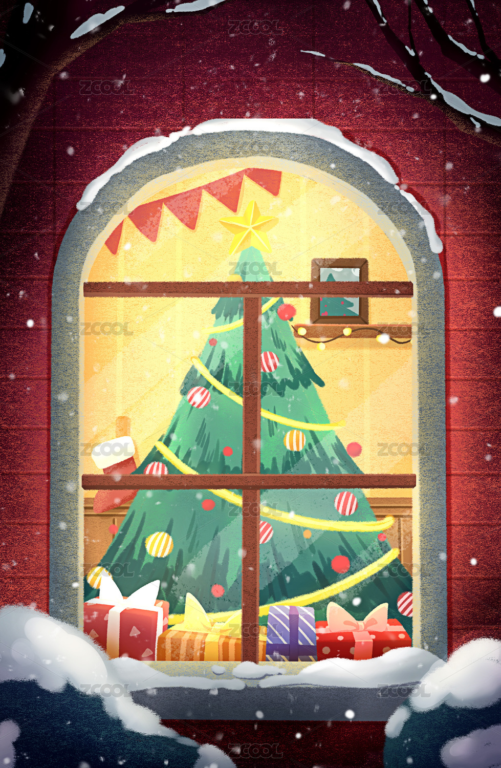 溫暖圣誕節(jié)夜晚窗口圣誕樹插畫
