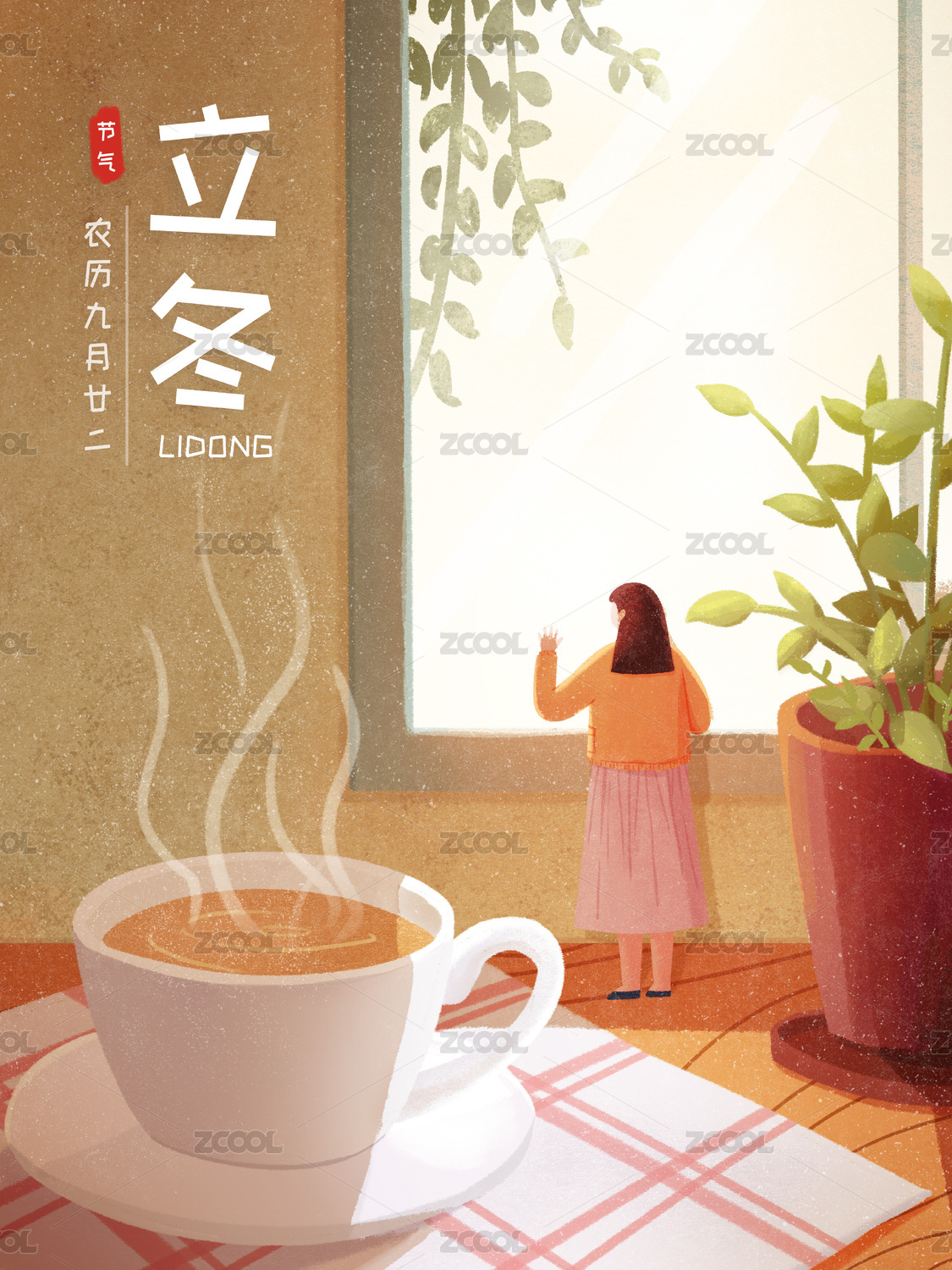 卡通手繪冬天節(jié)氣立冬溫暖室內(nèi)喝茶豎幅插畫