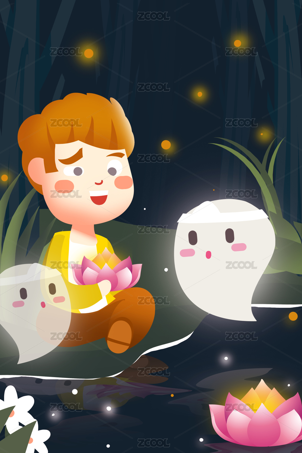 中元節(jié)鬼節(jié)小男孩河邊祭祀插畫