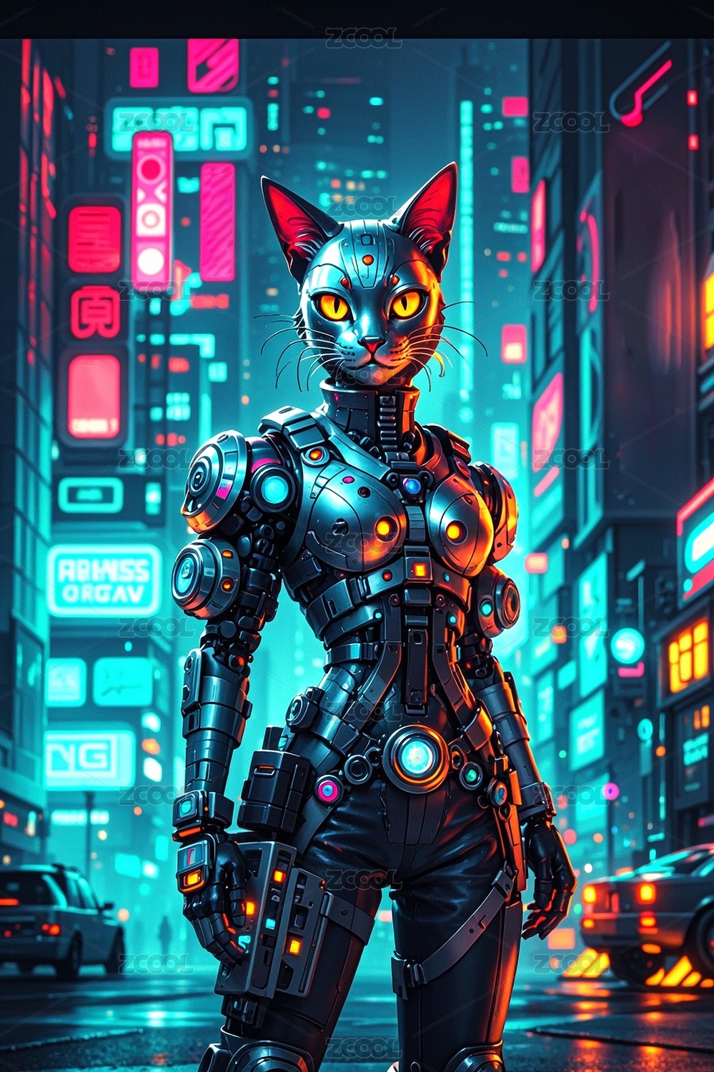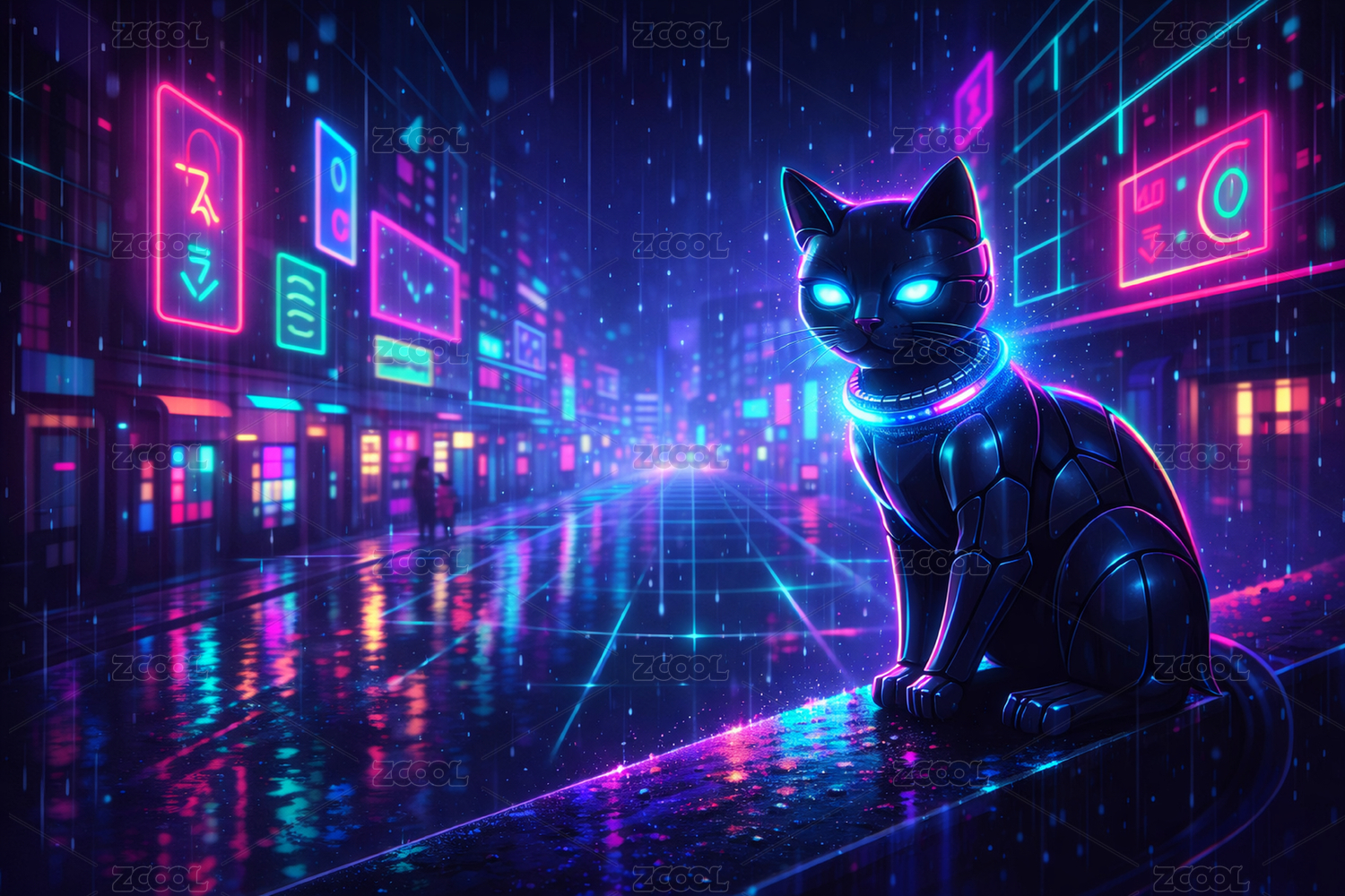 霓虹雨夜的機(jī)械貓