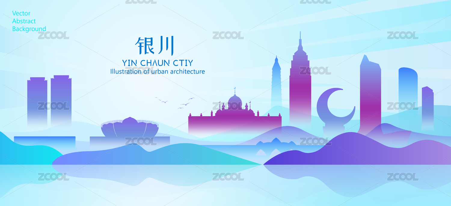 中國(guó)寧夏銀川市城市天際線漸變矢量插畫