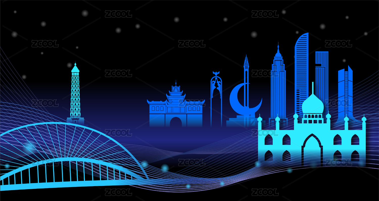 中國(guó)寧夏銀川市城市天際線夜景矢量插畫藍(lán)色