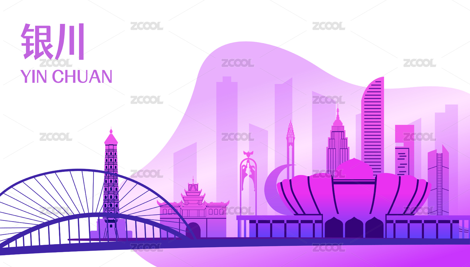 中國(guó)寧夏銀川市城市矢量插畫網(wǎng)頁(yè)版紫色