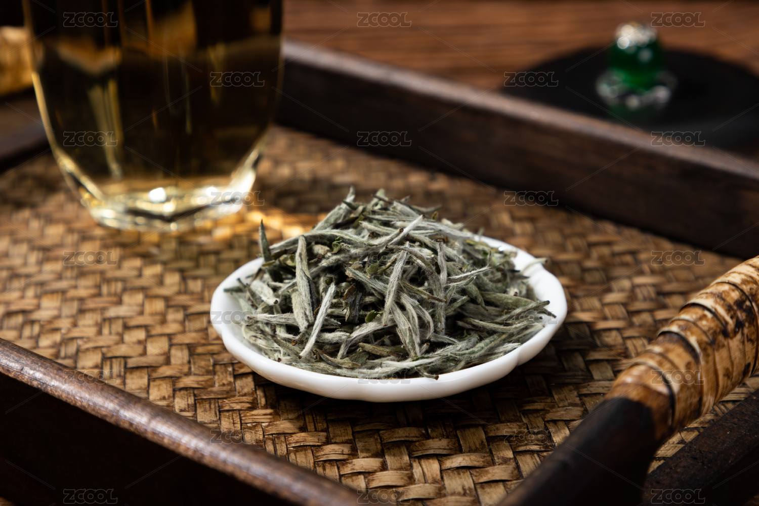 藍(lán)色背景中的老白茶壽眉茶葉特寫(xiě)