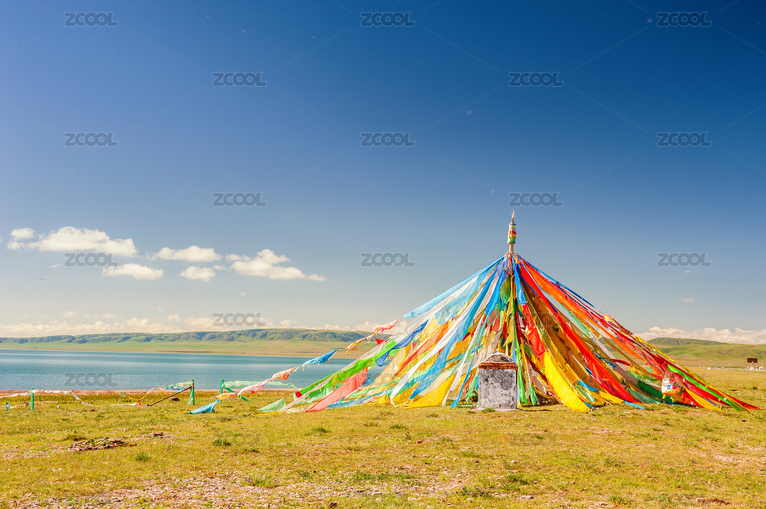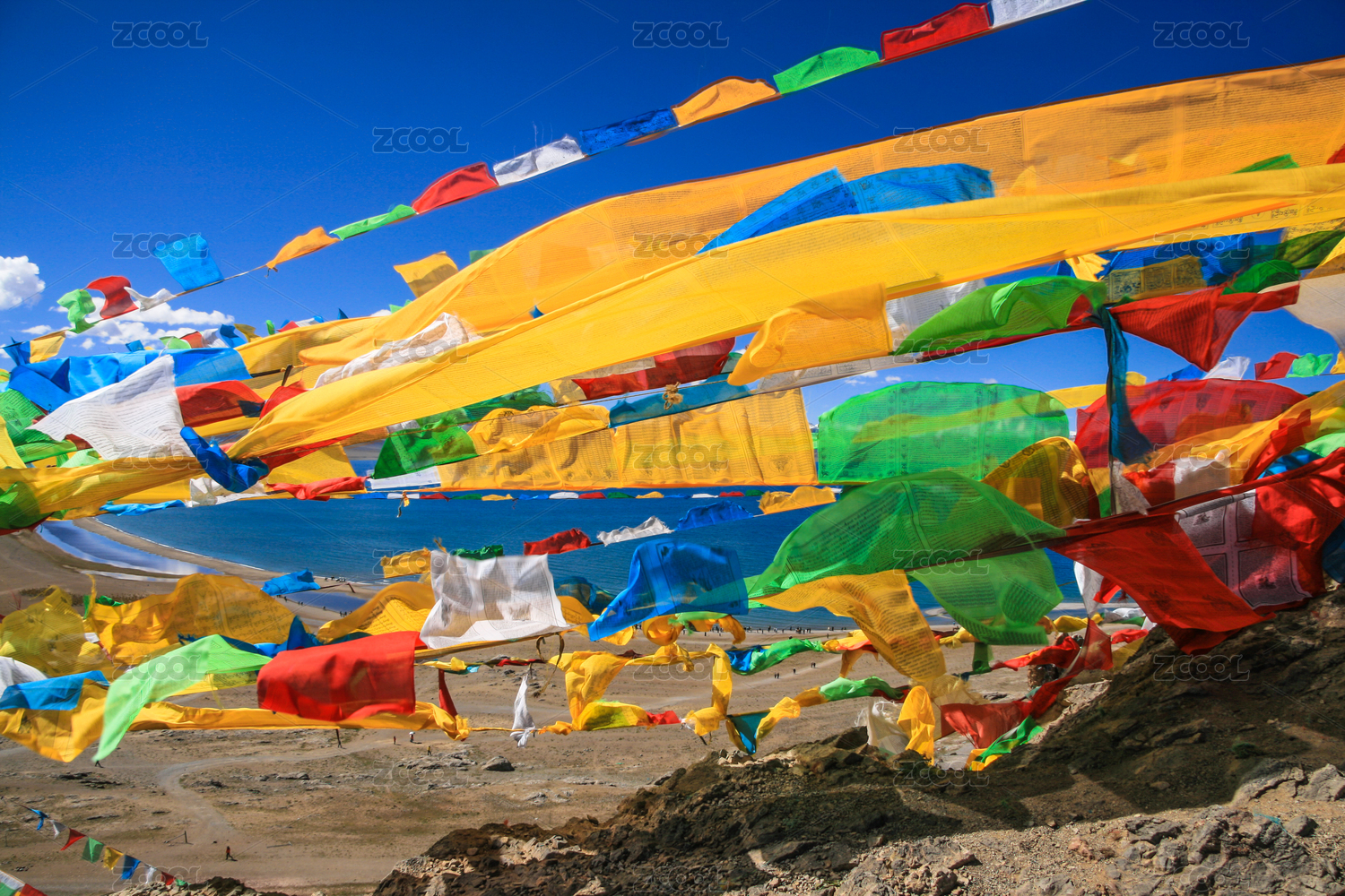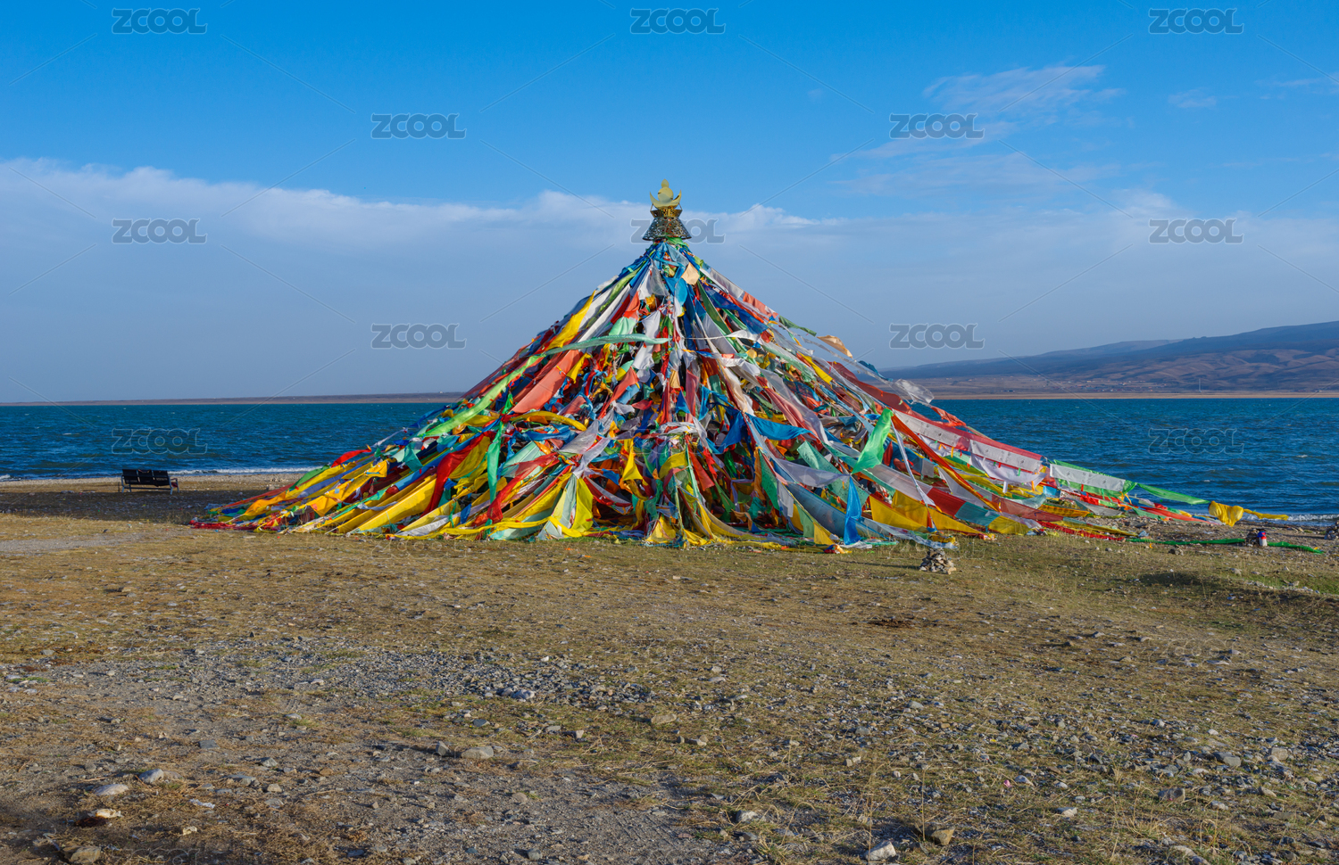 中國(guó)青海省青海湖景區(qū)湖岸經(jīng)幡