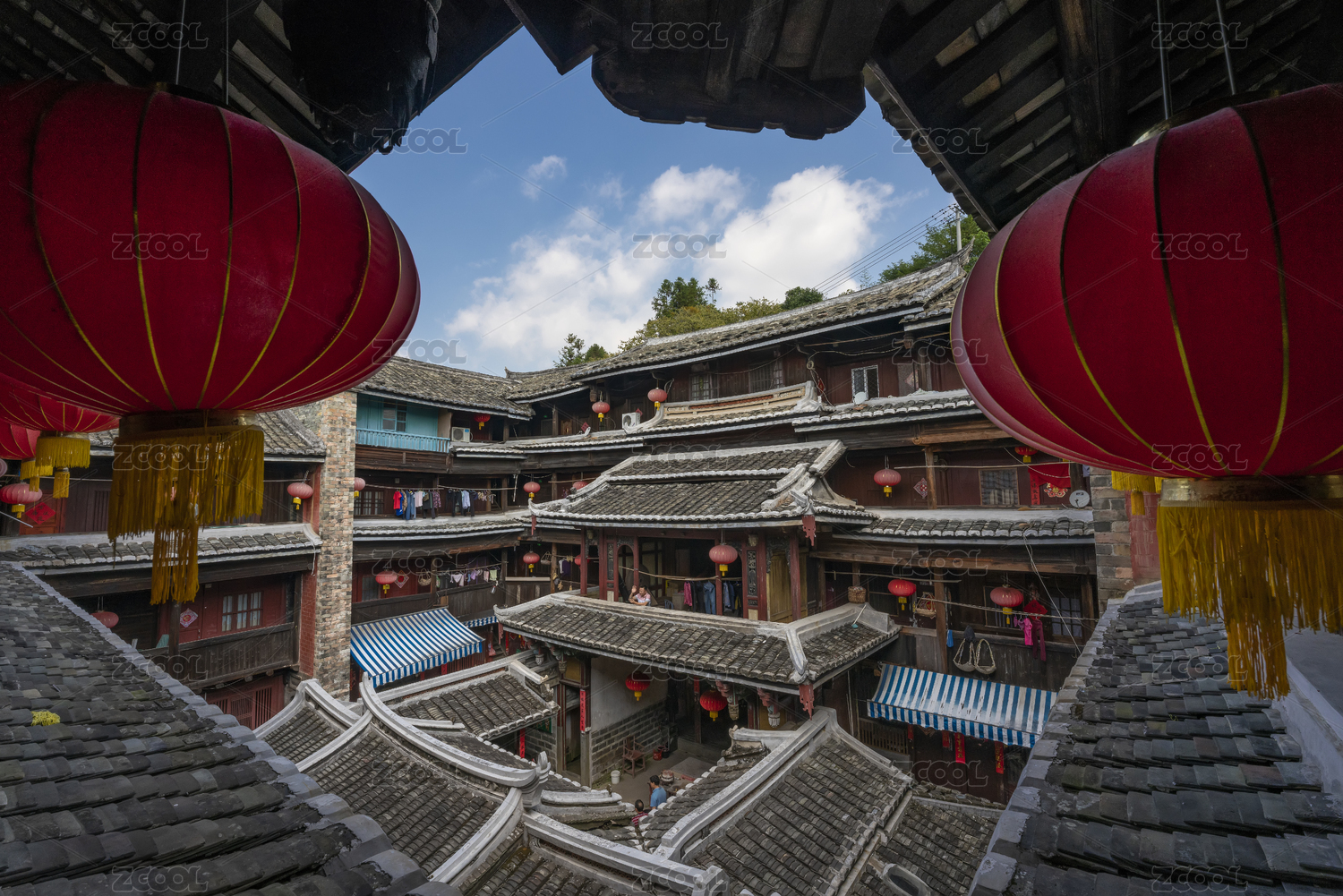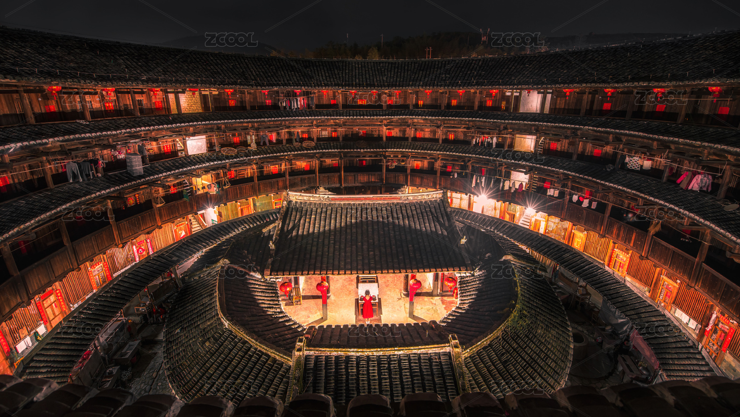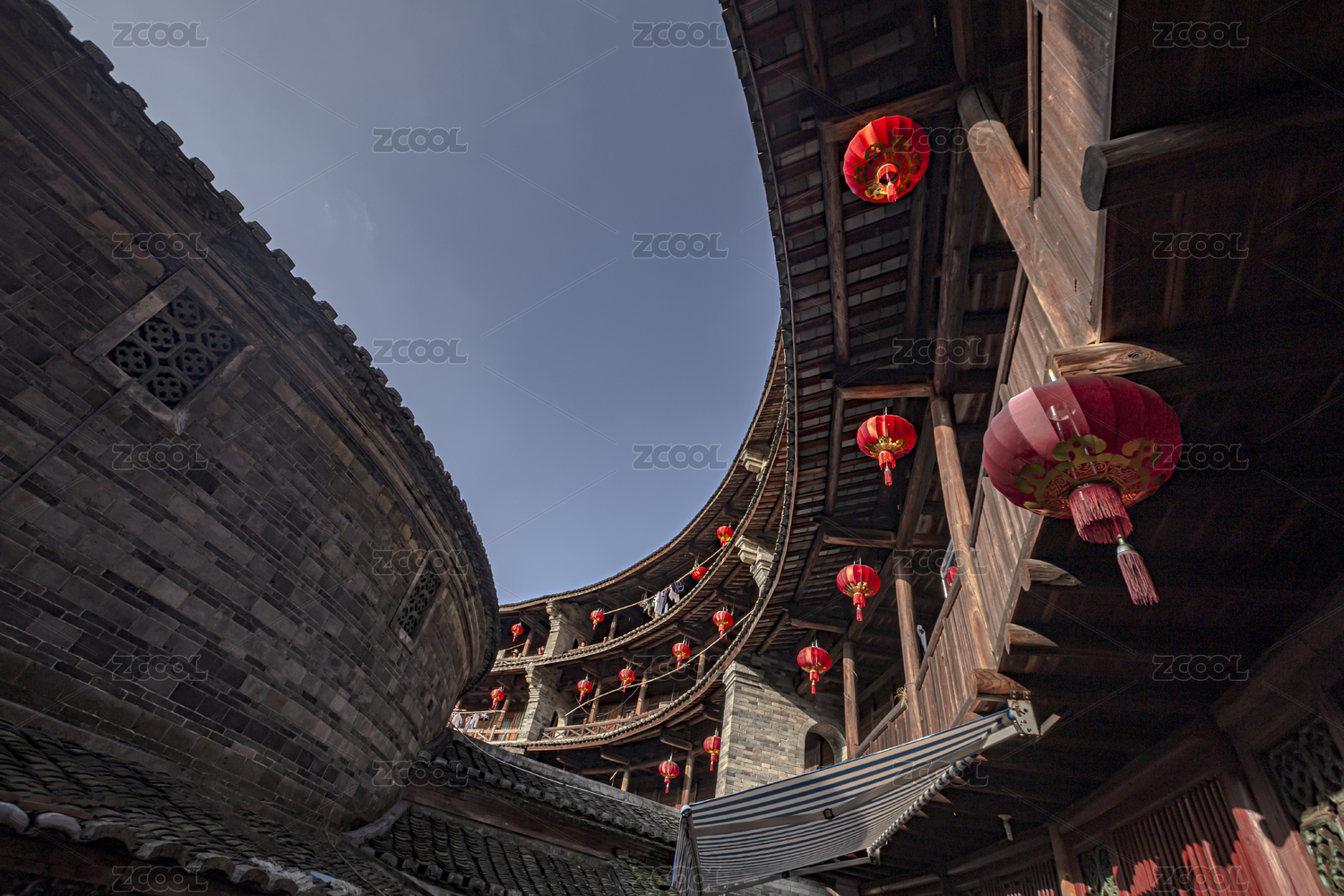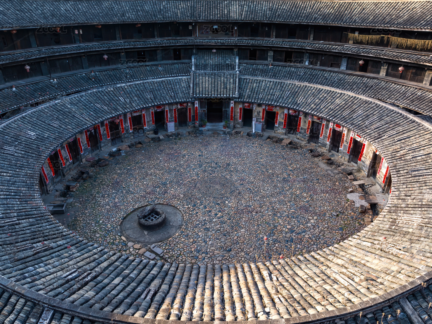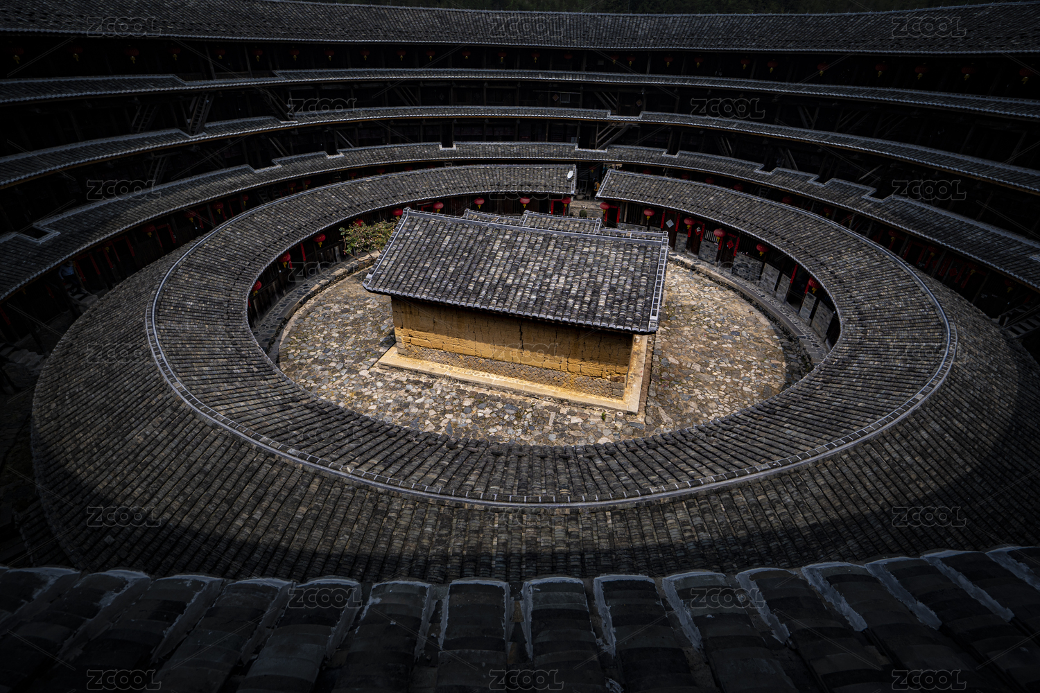 中國福建永定圓形土樓層疊的瓦片及中間小屋