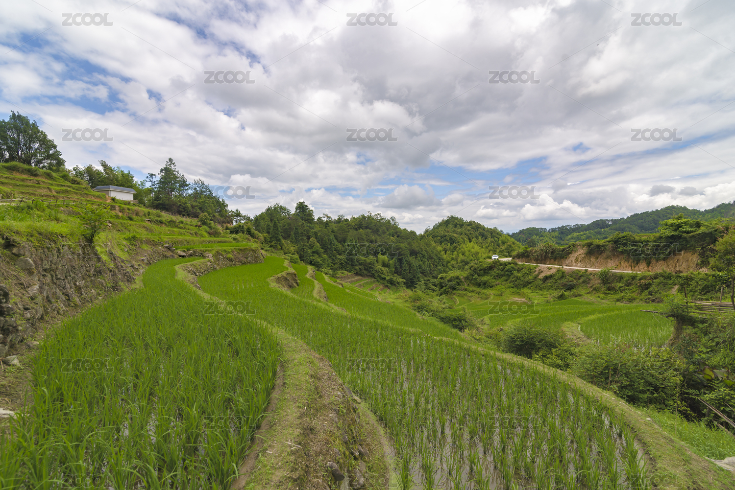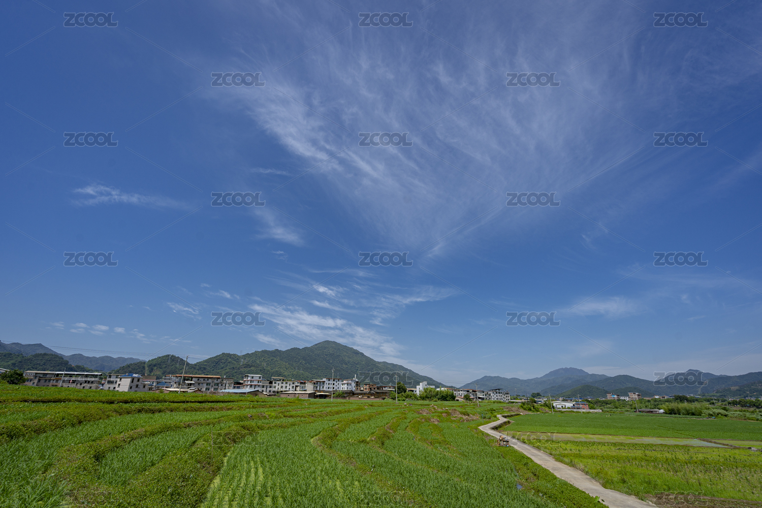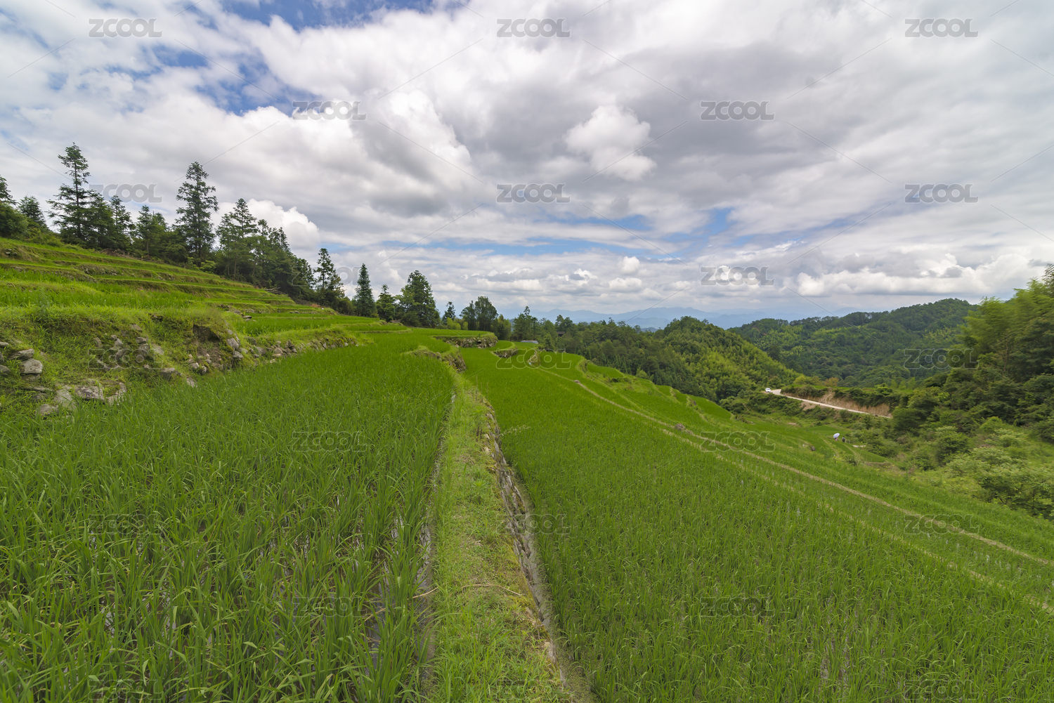 藍(lán)天白云下山谷中插滿秧苗的梯田風(fēng)光,中國福建連城