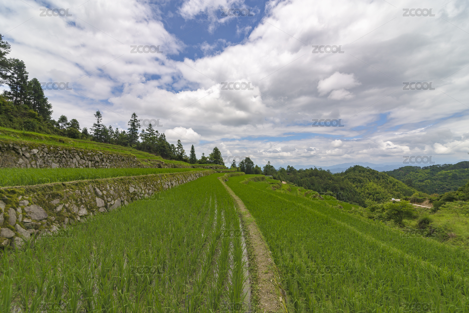 藍(lán)天白云下山谷中插滿秧苗的石砌梯田風(fēng)光,中國福建連城