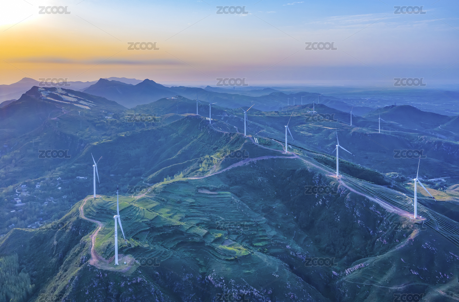 航拍中國(guó)河南禹州市具茨山上的風(fēng)電光伏