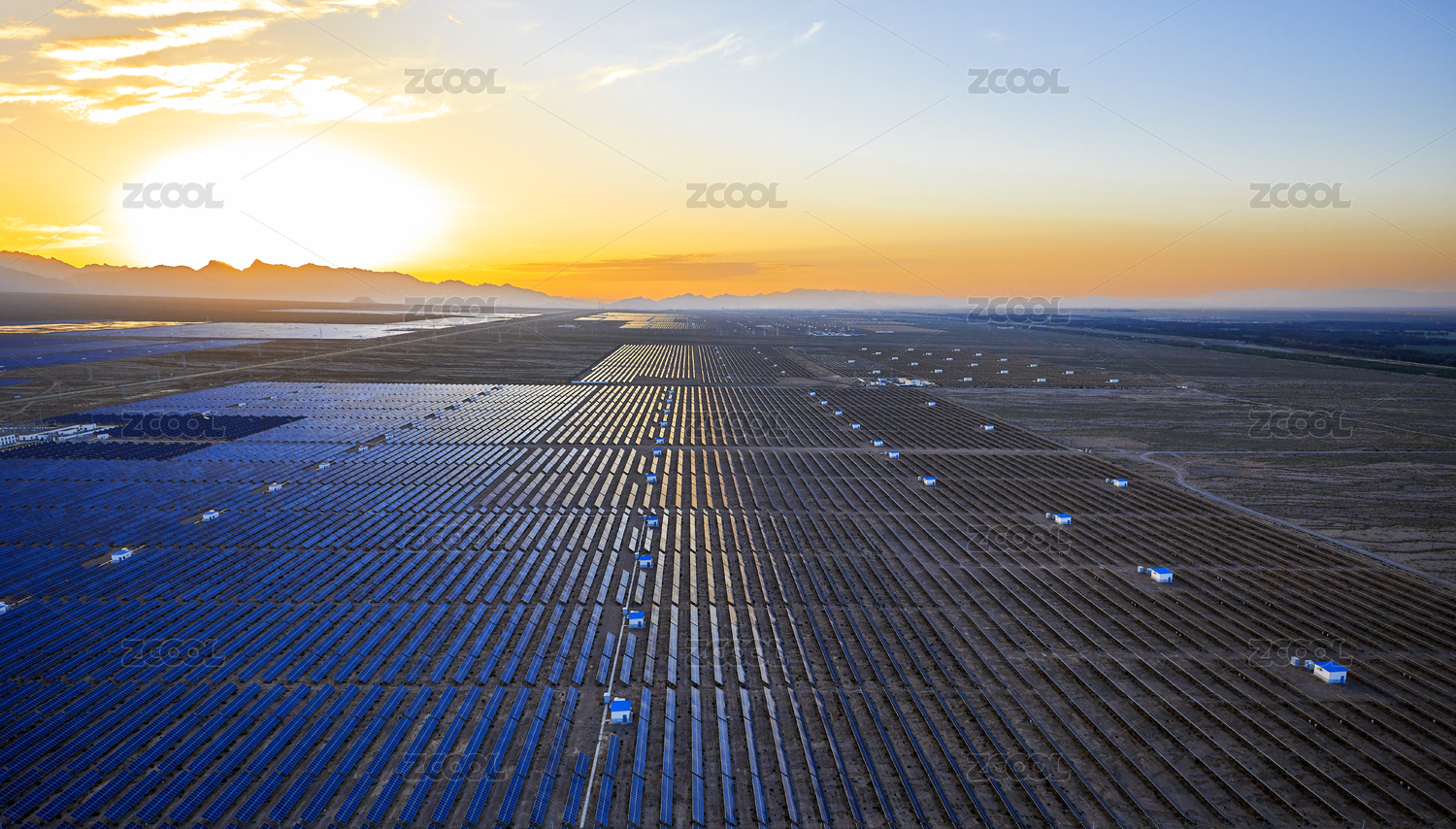 航拍夕陽照射下的大型光伏基地