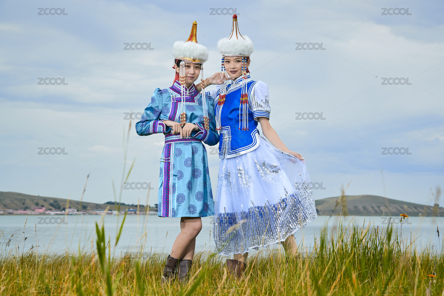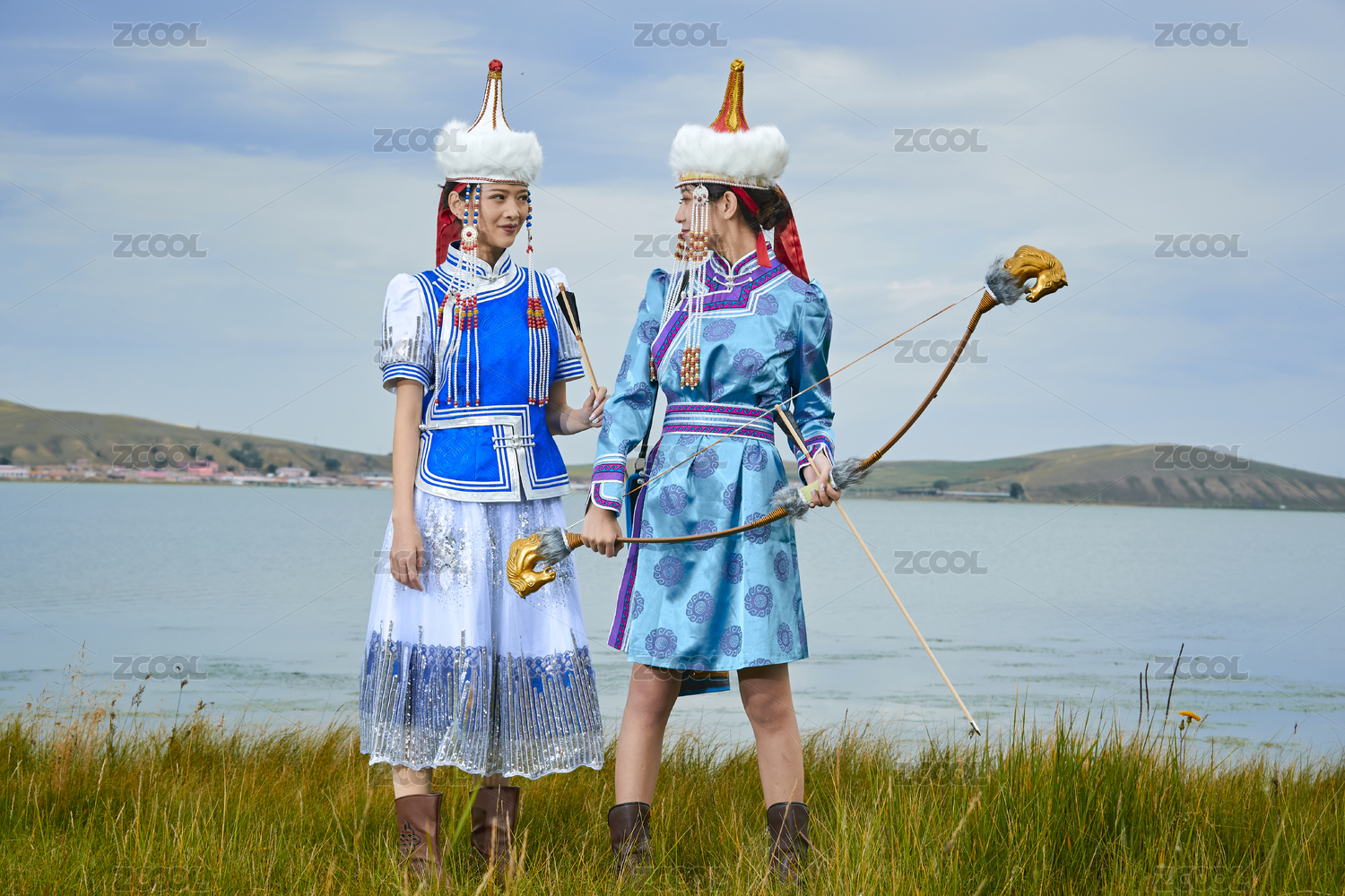 草原湖畔手持弓箭狩獵的蒙族小姐妹