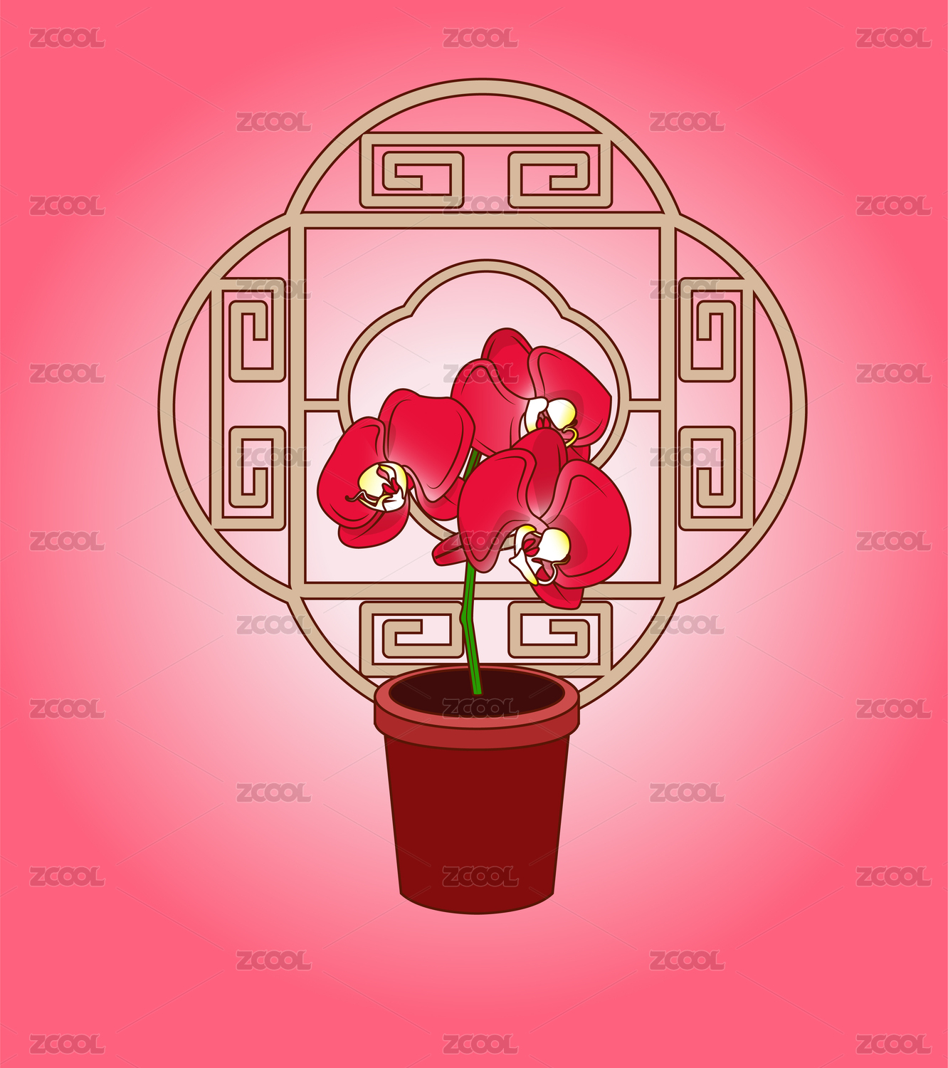 國風(fēng)中式框景古典美學(xué)花窗蝴蝶蘭花矢量插畫