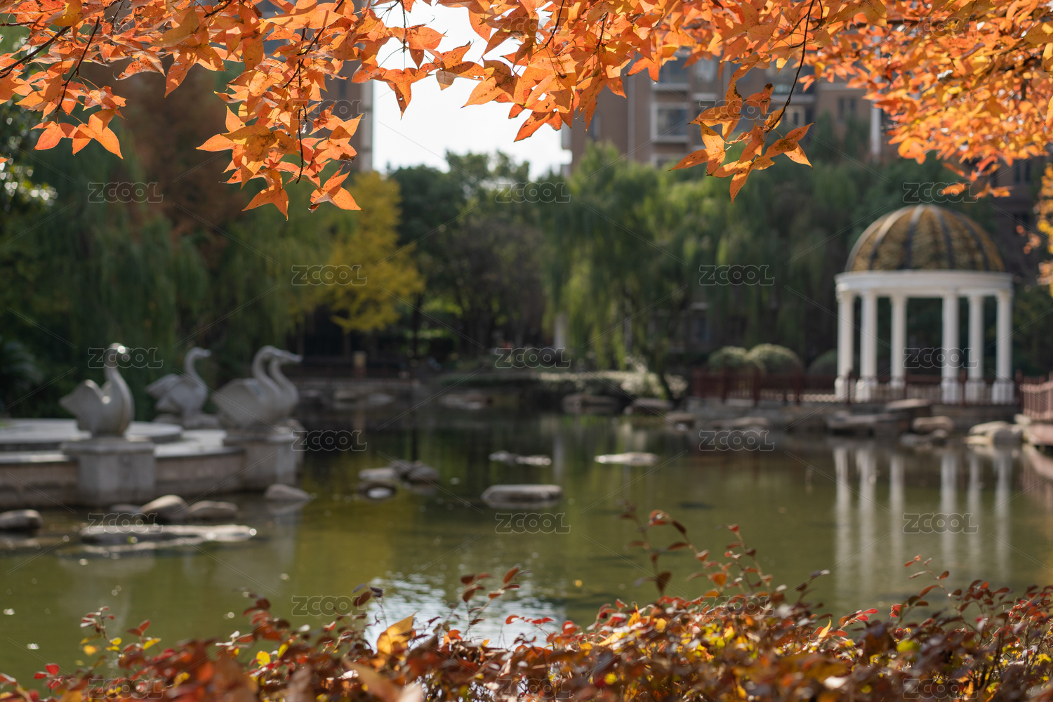 秋天楓香紅葉框景后的小區(qū)湖面和景觀亭