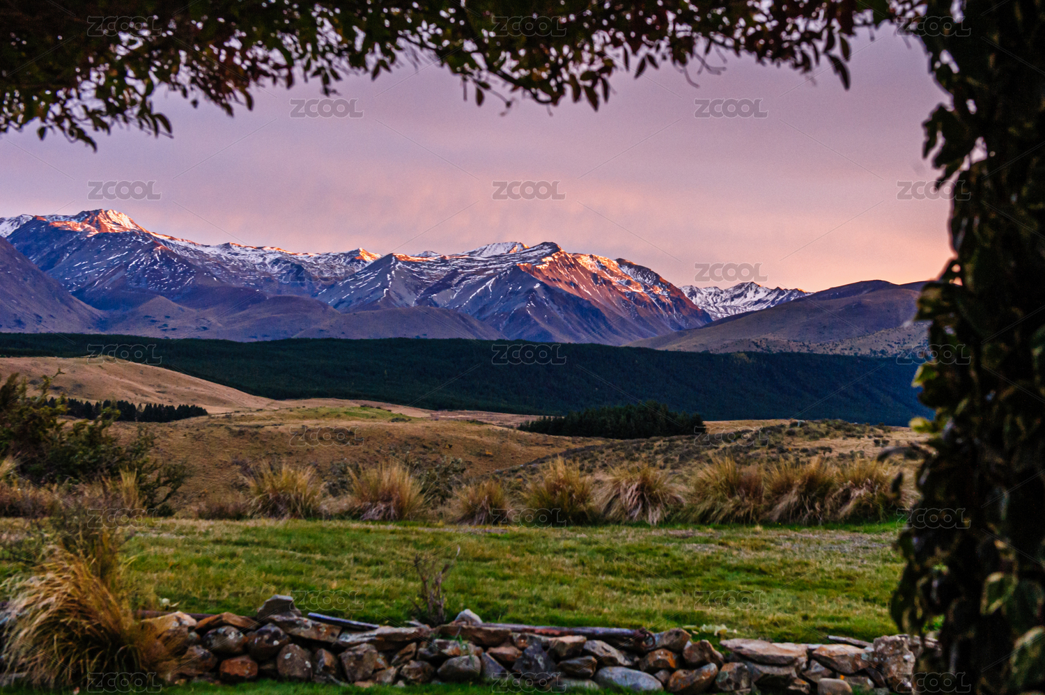 普卡基湖畔清晨:樹葉框景與雪山金輝