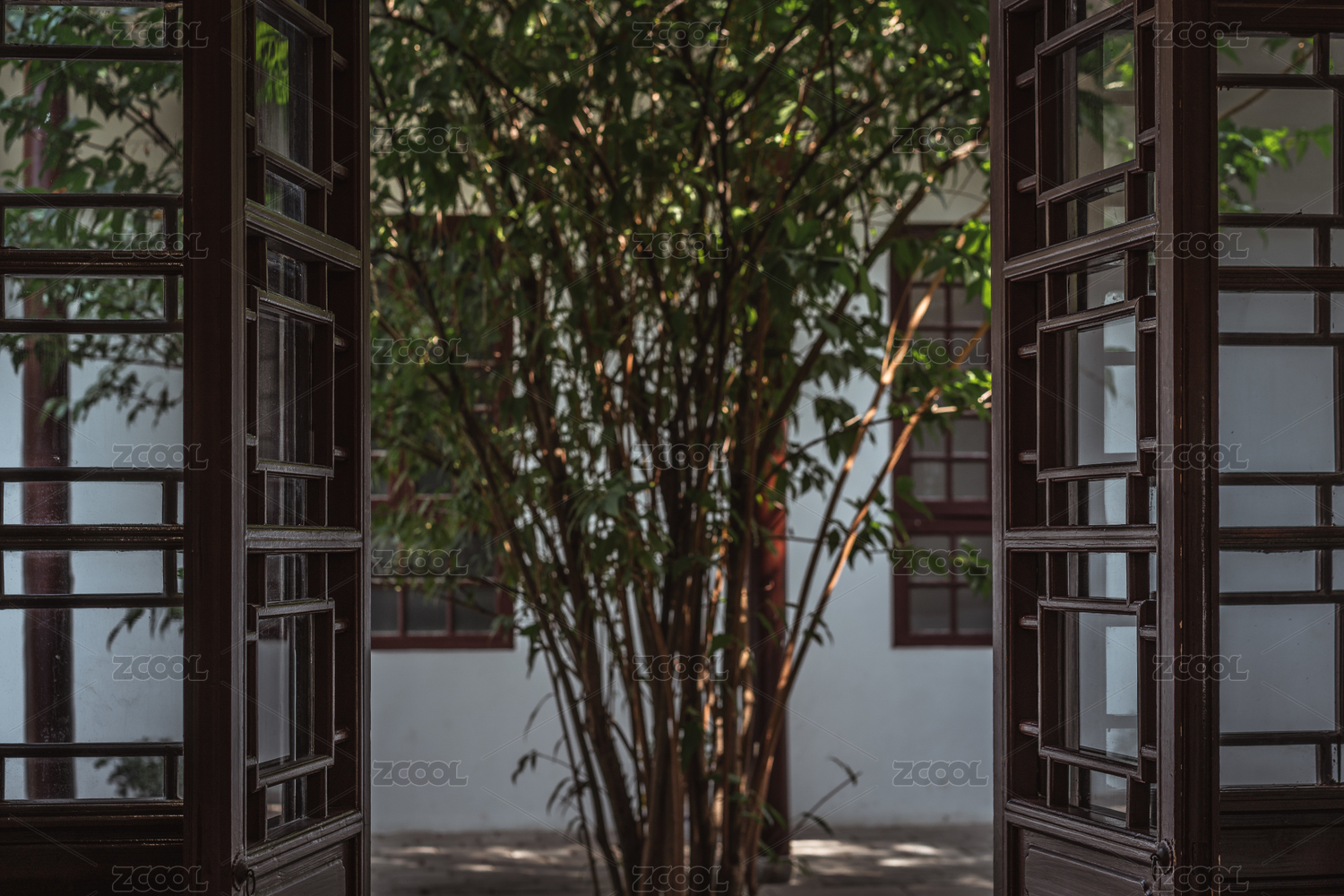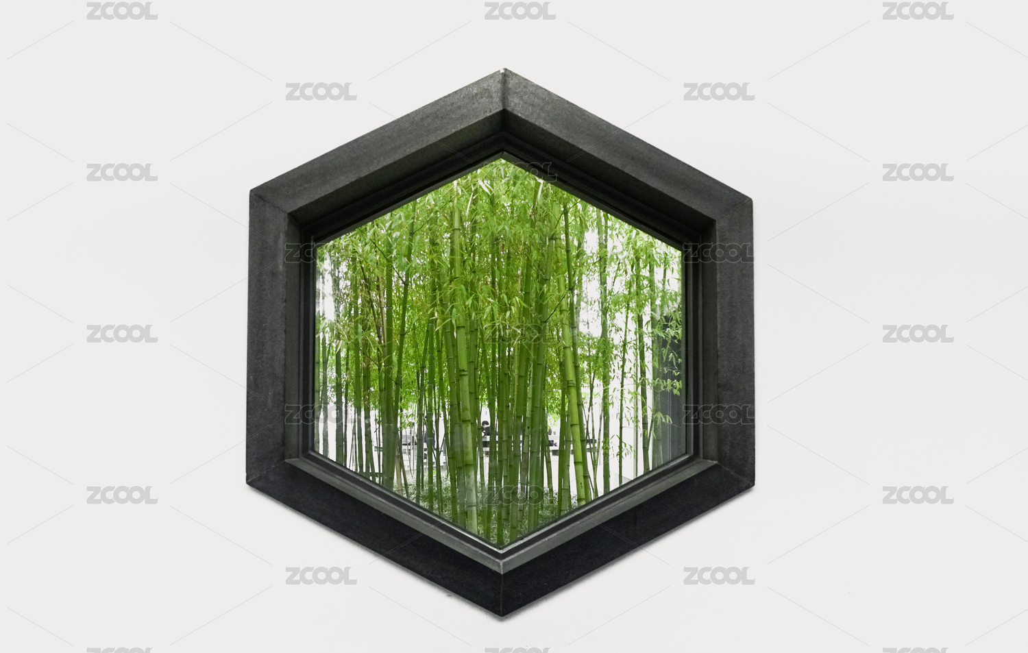 半開雕花玻璃窗與庭園內(nèi)竹子框景