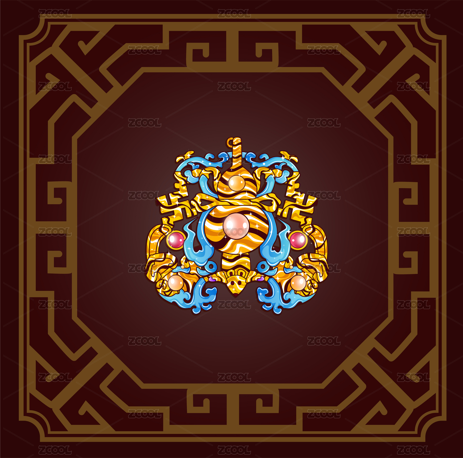 國風(fēng)中式框景古典花窗金銀珠寶裝飾矢量插畫