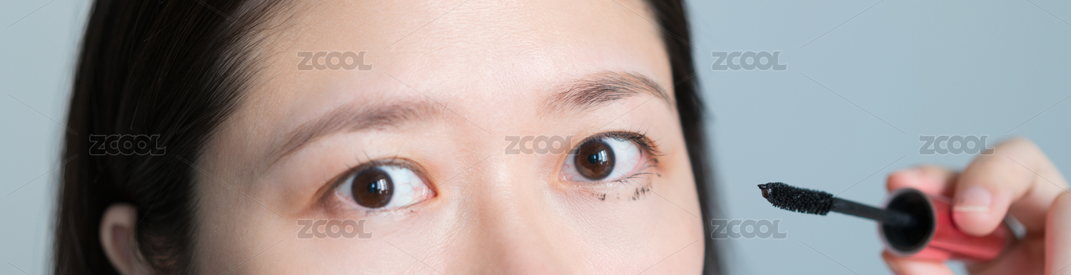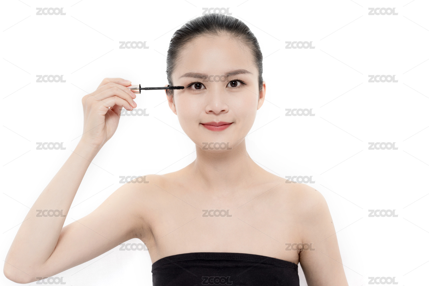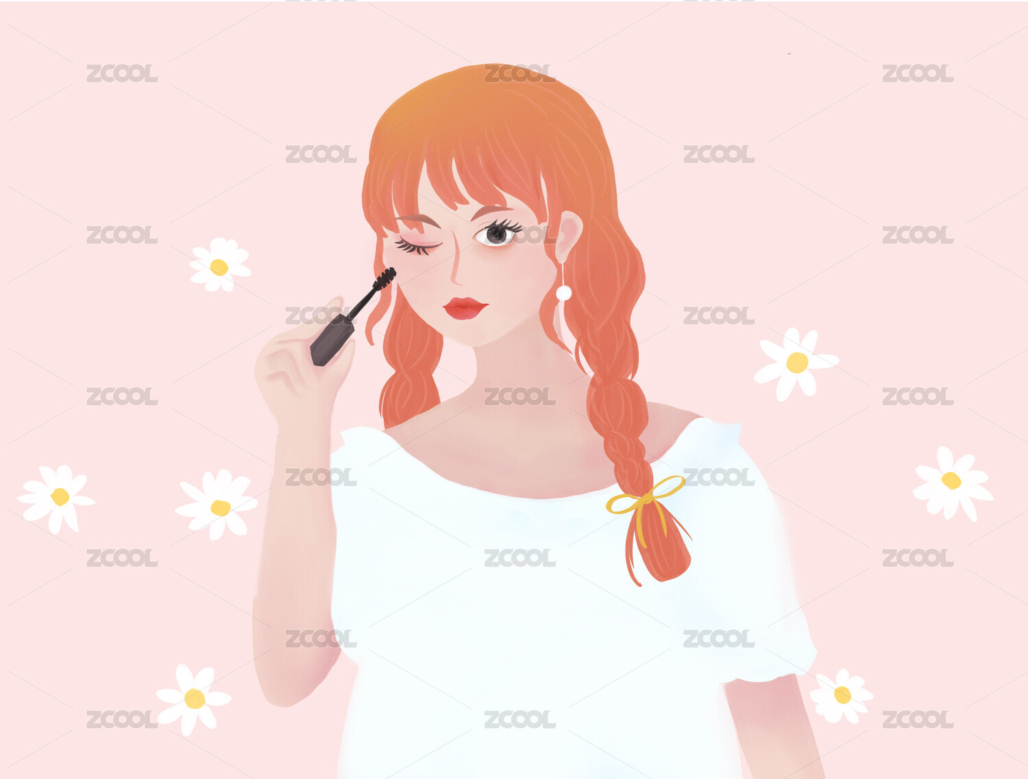 穿著白色衣服的少女拿著睫毛膏化妝的插畫