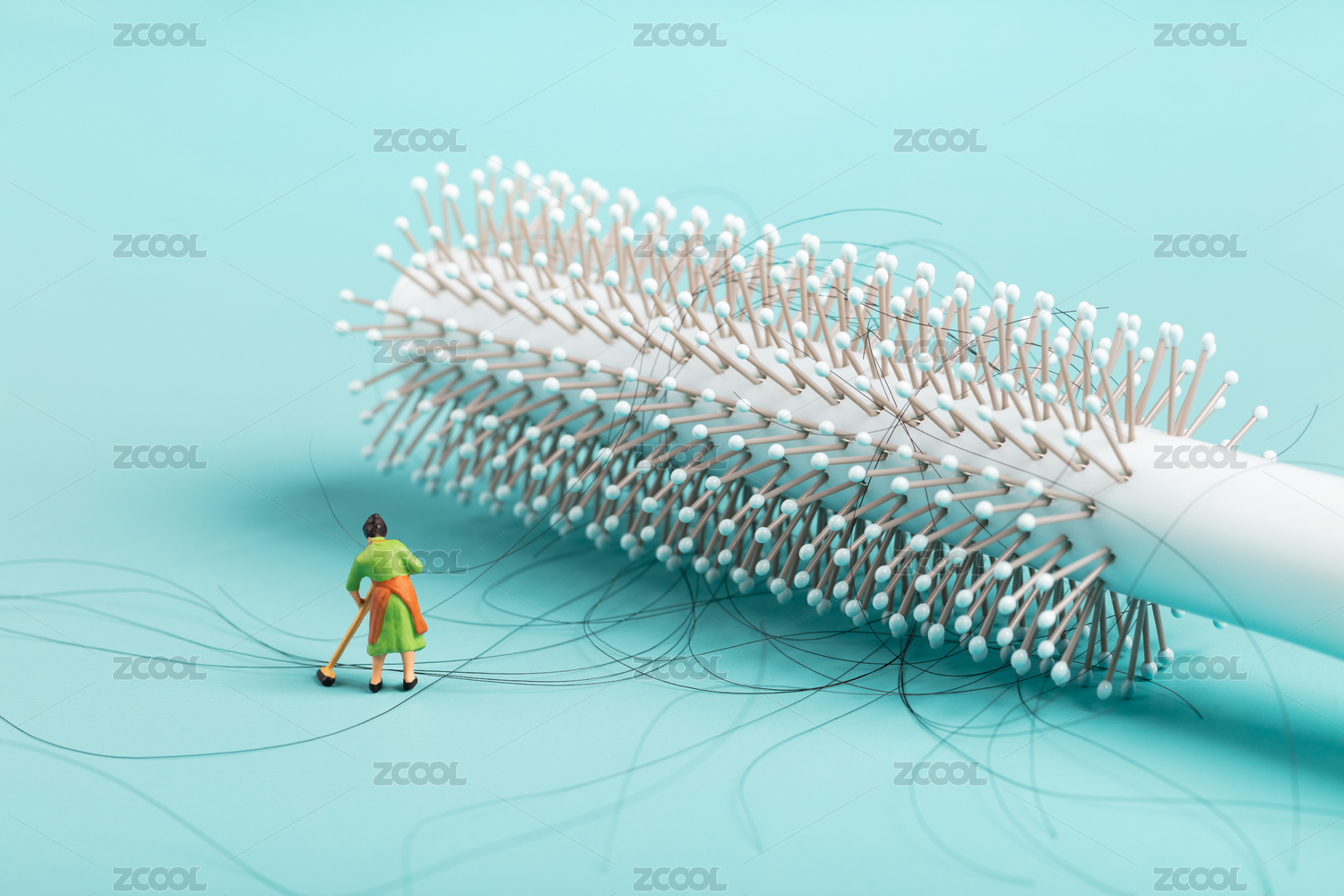 微縮場(chǎng)景脫發(fā)梳子上掉落的頭發(fā)和清理的小人