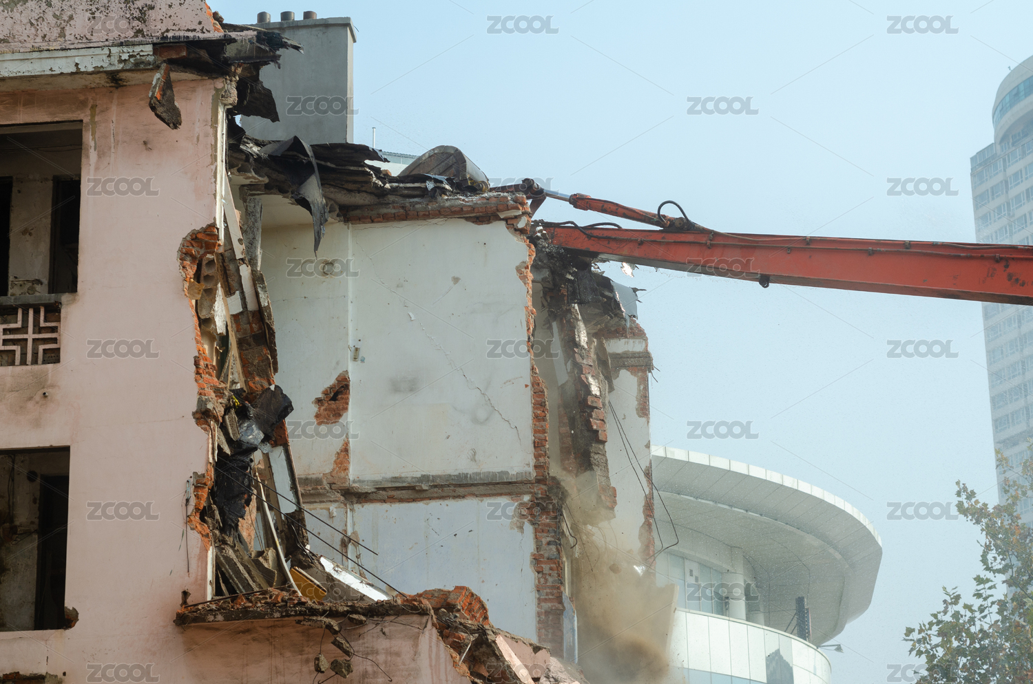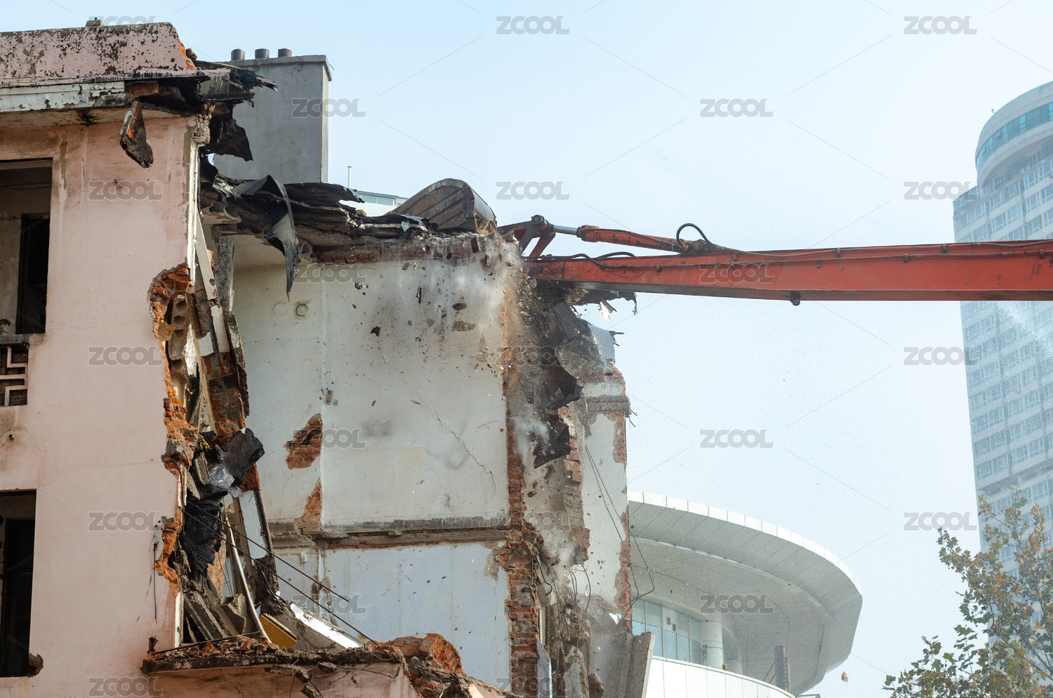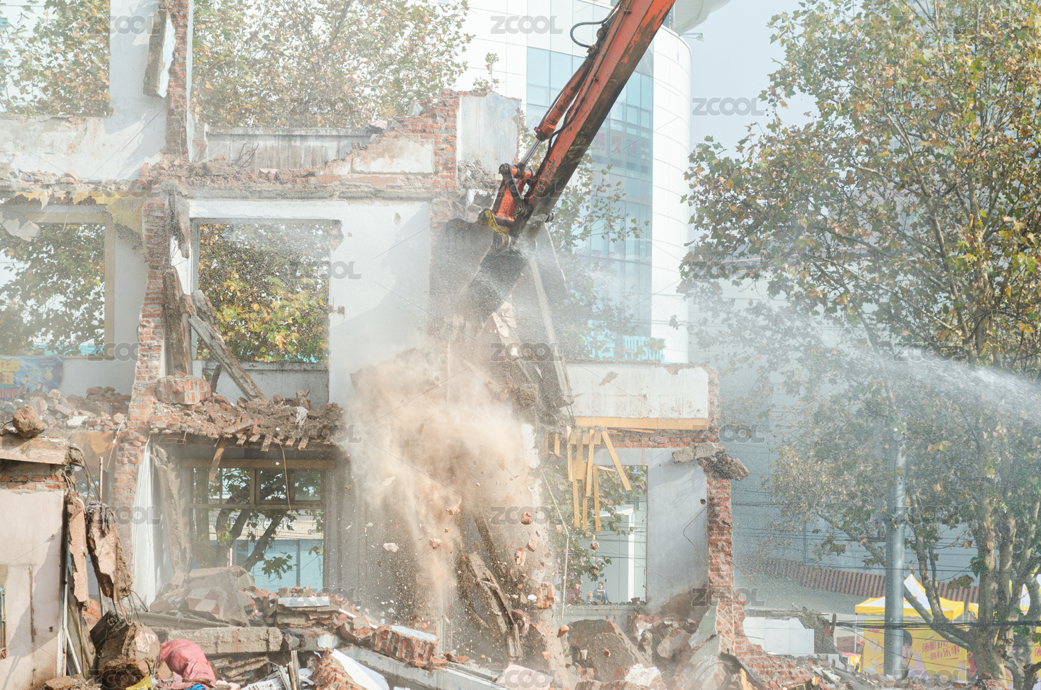 挖掘機的挖斗正在對老樓進行拆除,塵土飛揚
