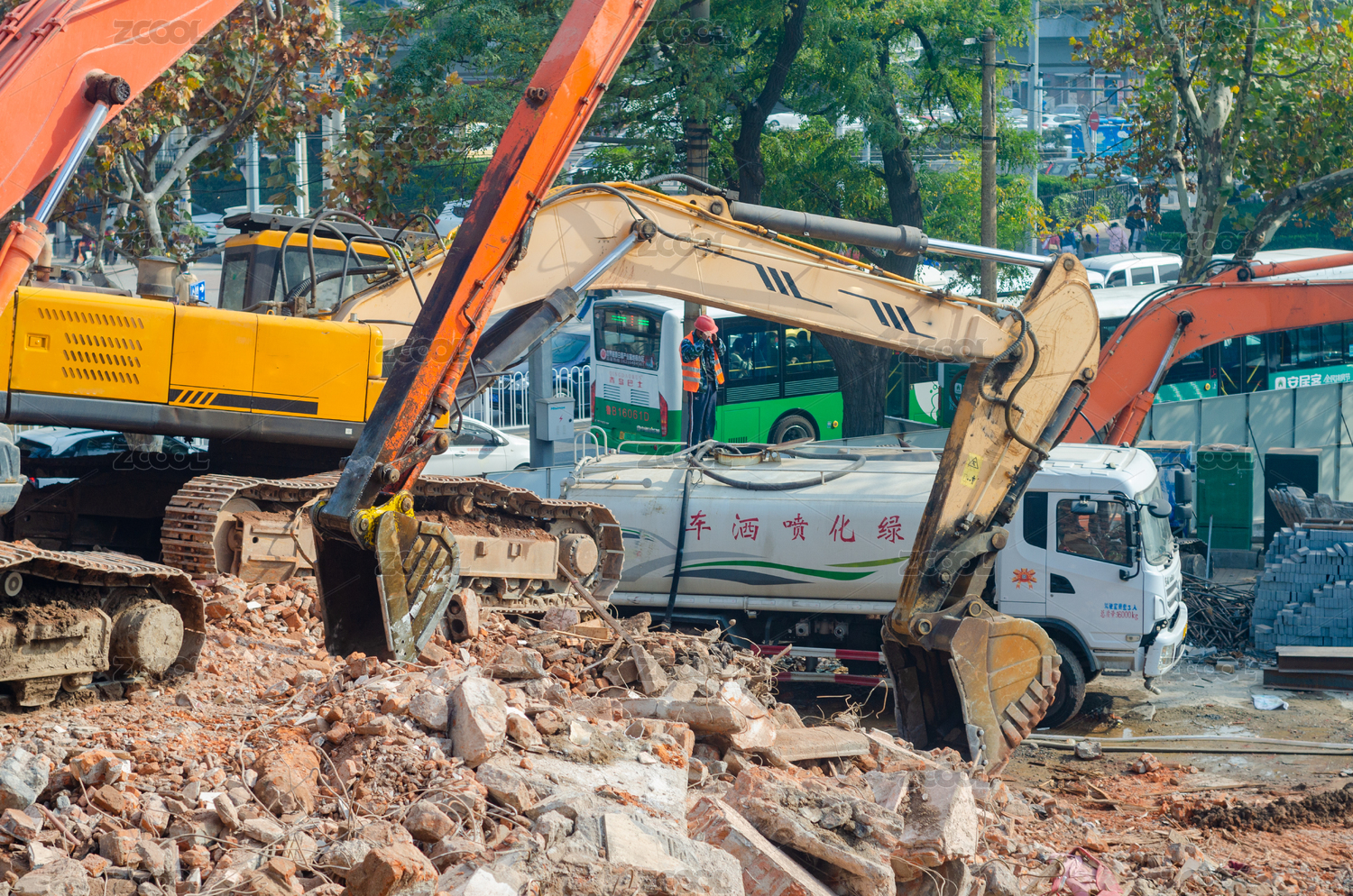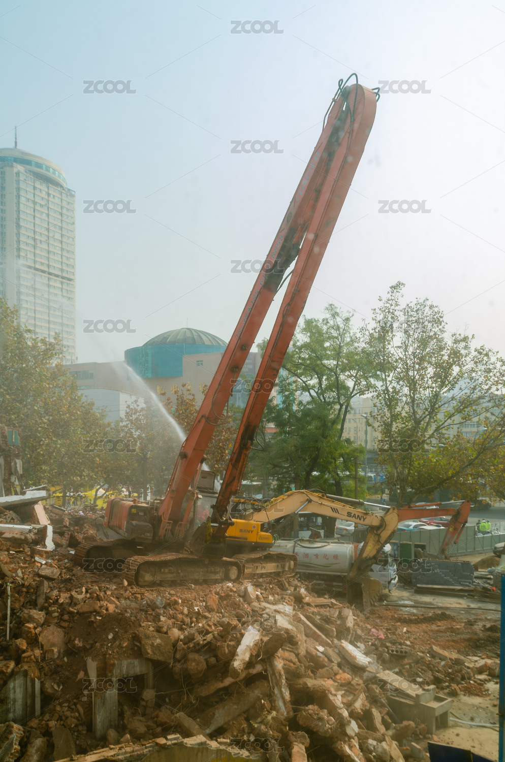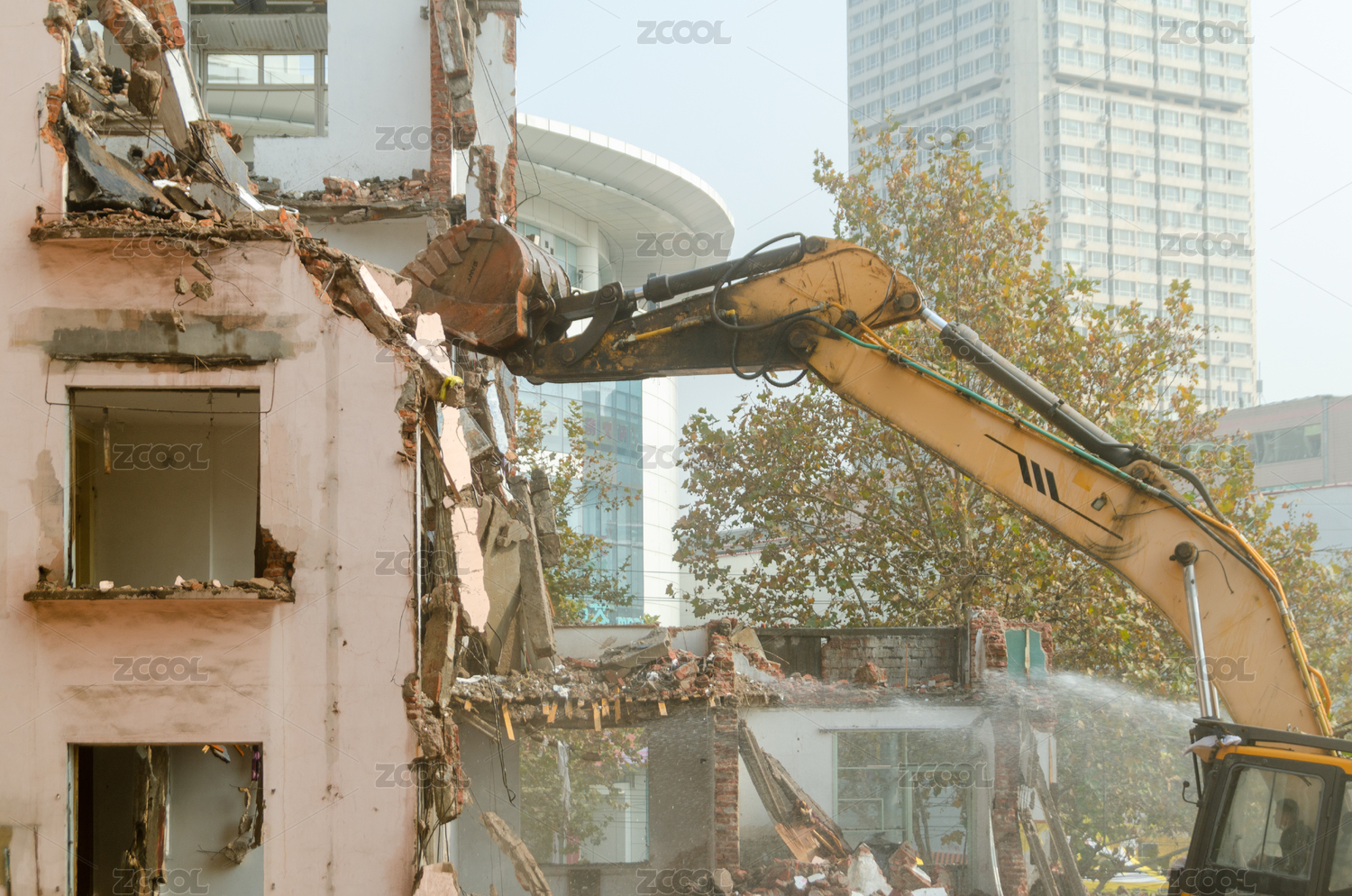 挖掘機的挖斗正在對老樓進行拆除,塵土飛揚