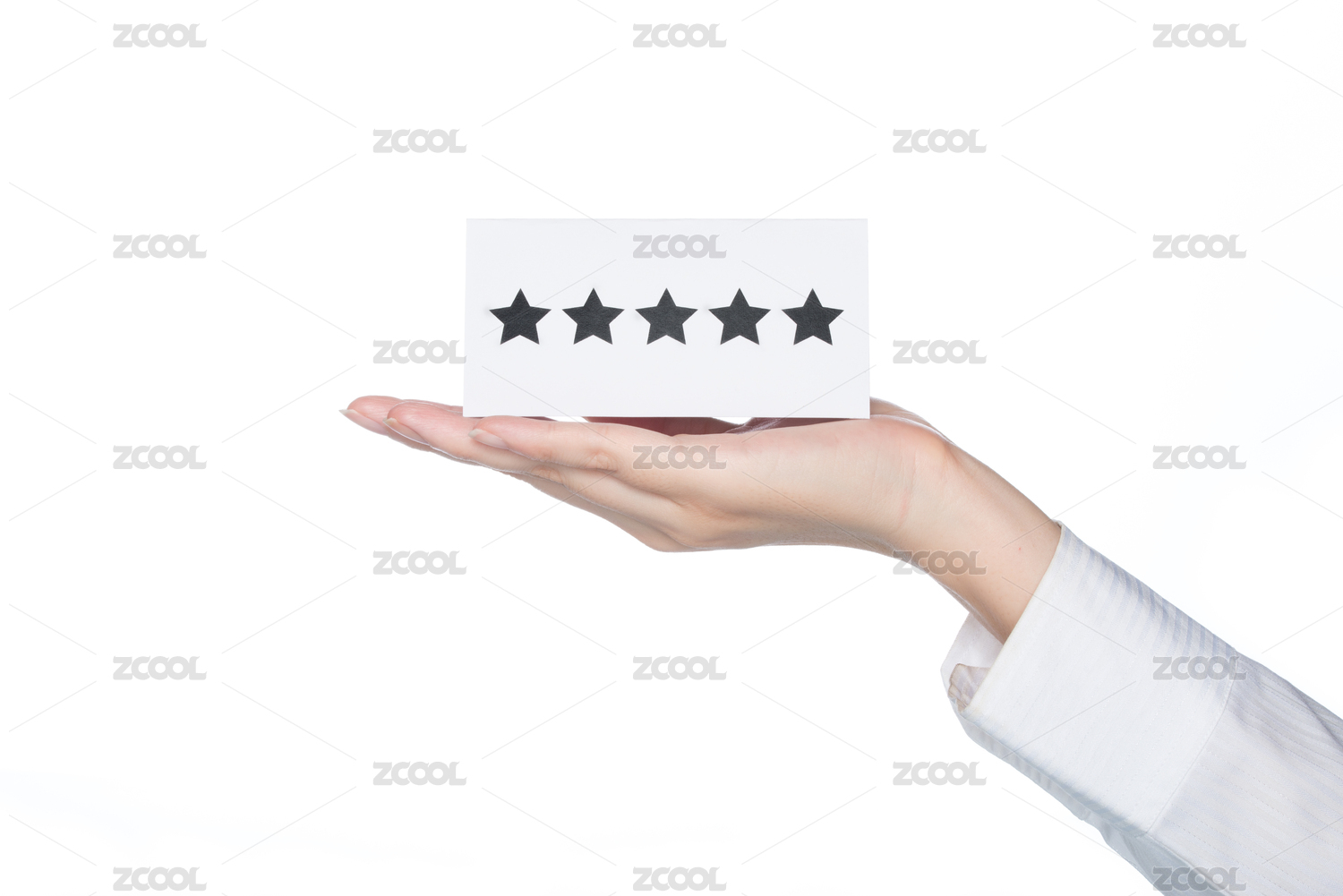 女子手拿著五星形狀卡在白色背景,一流的服務(wù)
