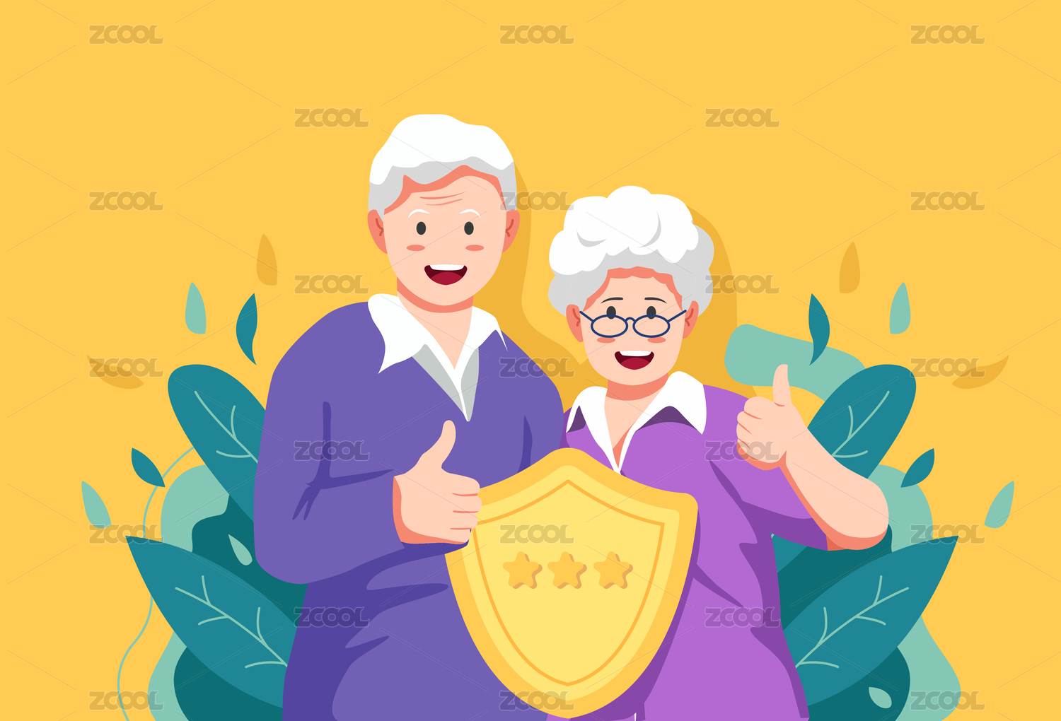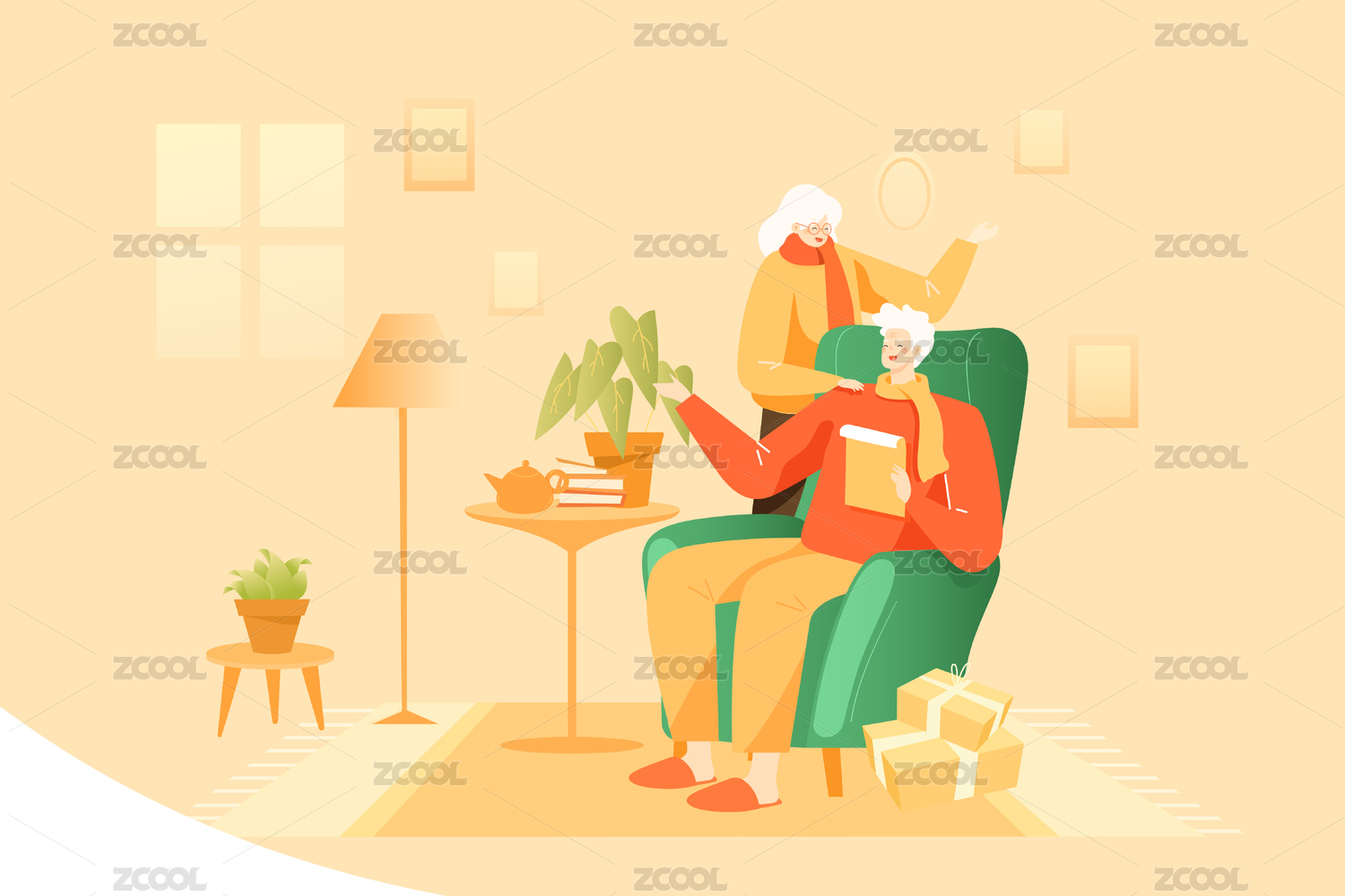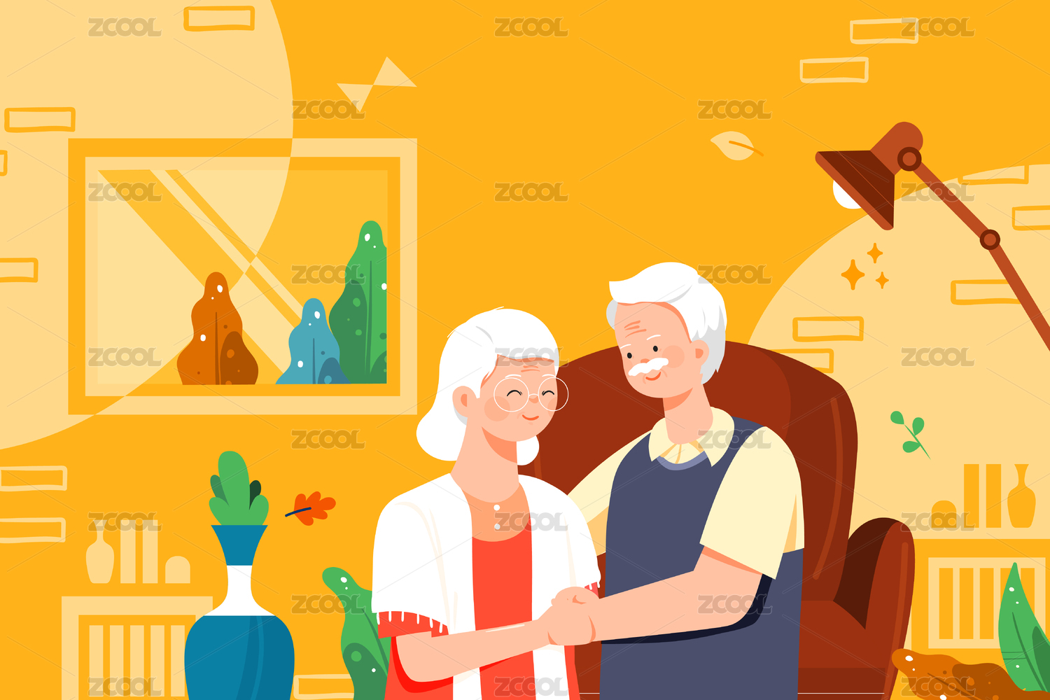 老年人夫妻在家中沙發(fā)上相擁 可愛風格重陽節(jié)老年人愜意生活插畫