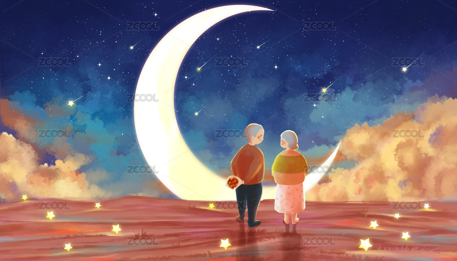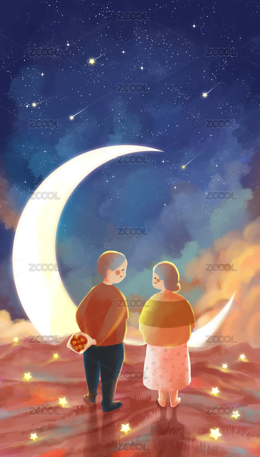 月亮星空下步行的老年夫妻背影溫馨夢幻手繪插畫