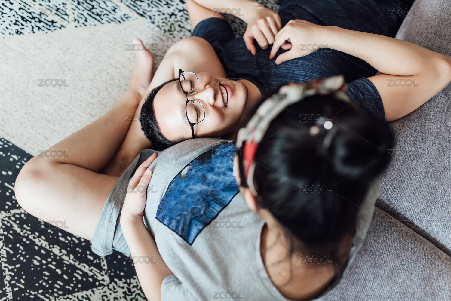 一對亞洲的老年夫妻在沙發(fā)上看向鏡頭