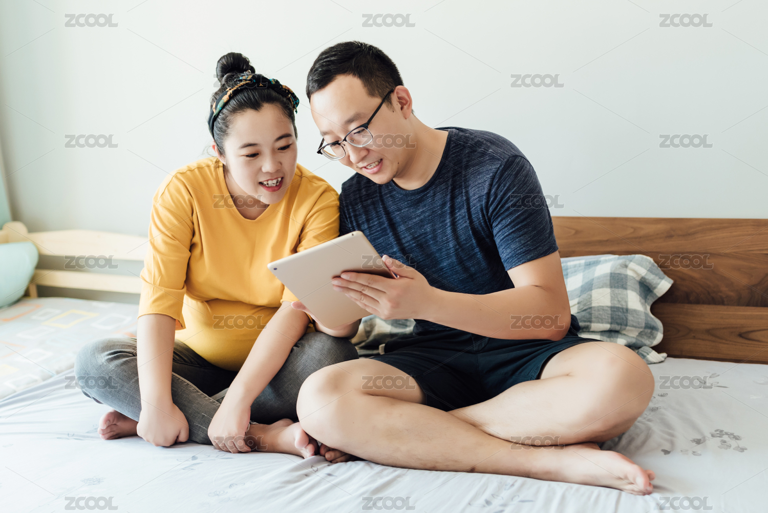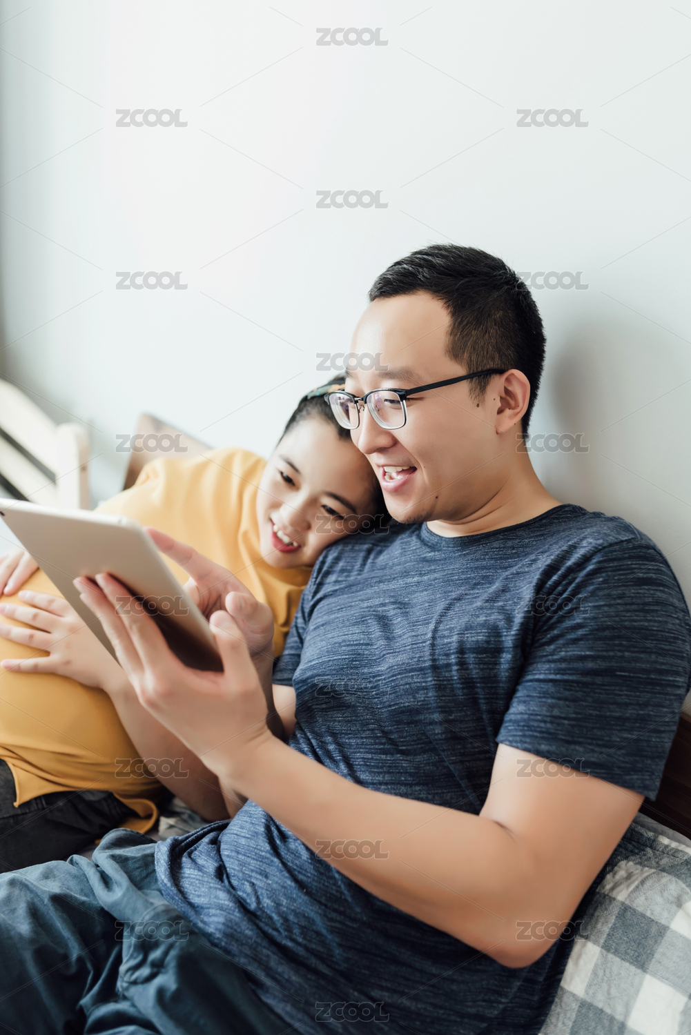 一對亞洲的老年夫妻在沙發(fā)上使用電子設備
