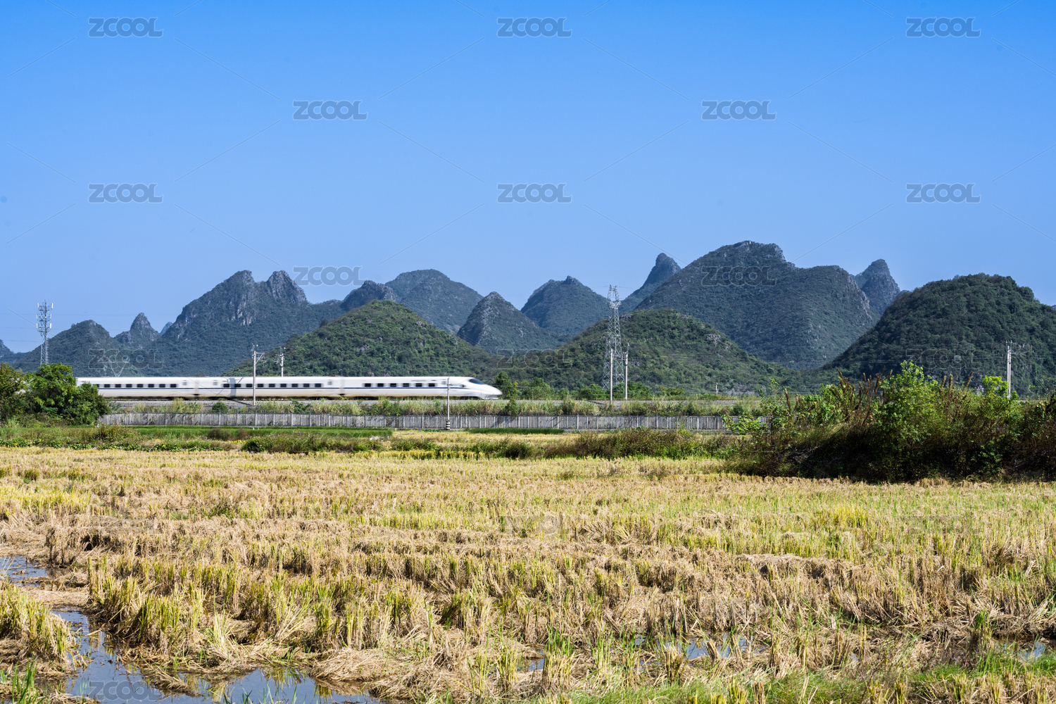 萬里無云天空下桂林山邊鐵路上的高速列車