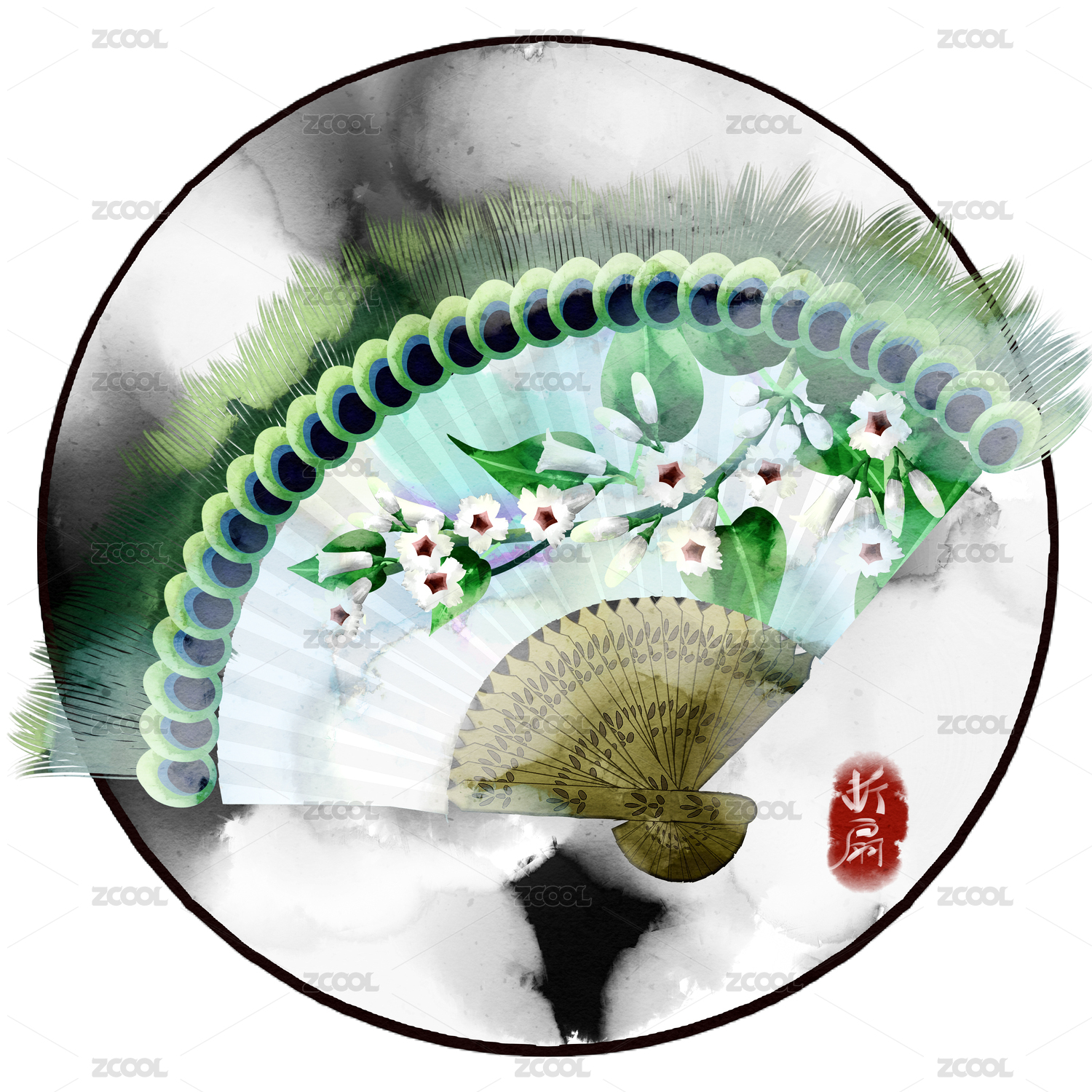 水彩風(fēng)格中國(guó)古代孔雀羽毛扇子插畫元素