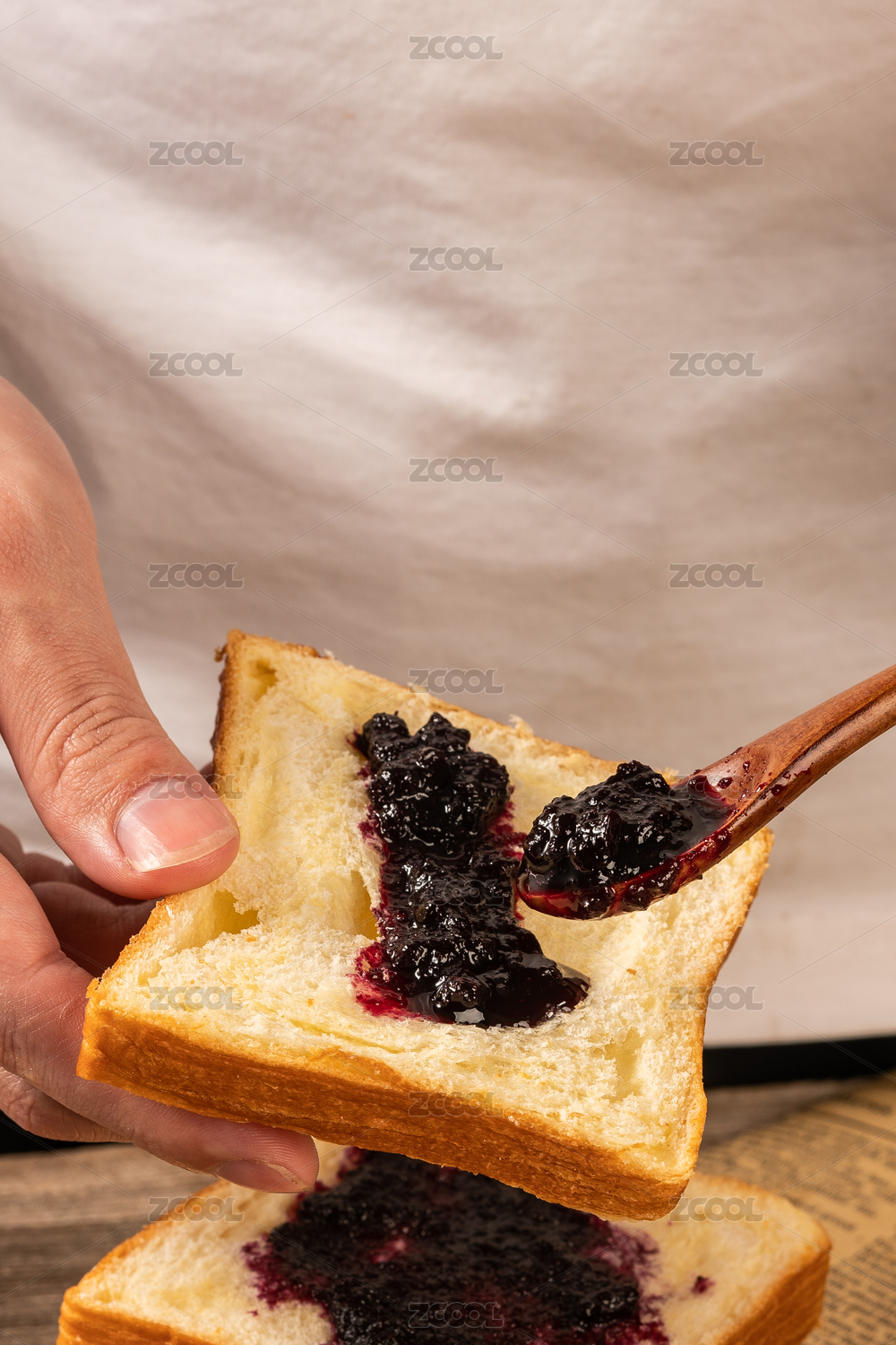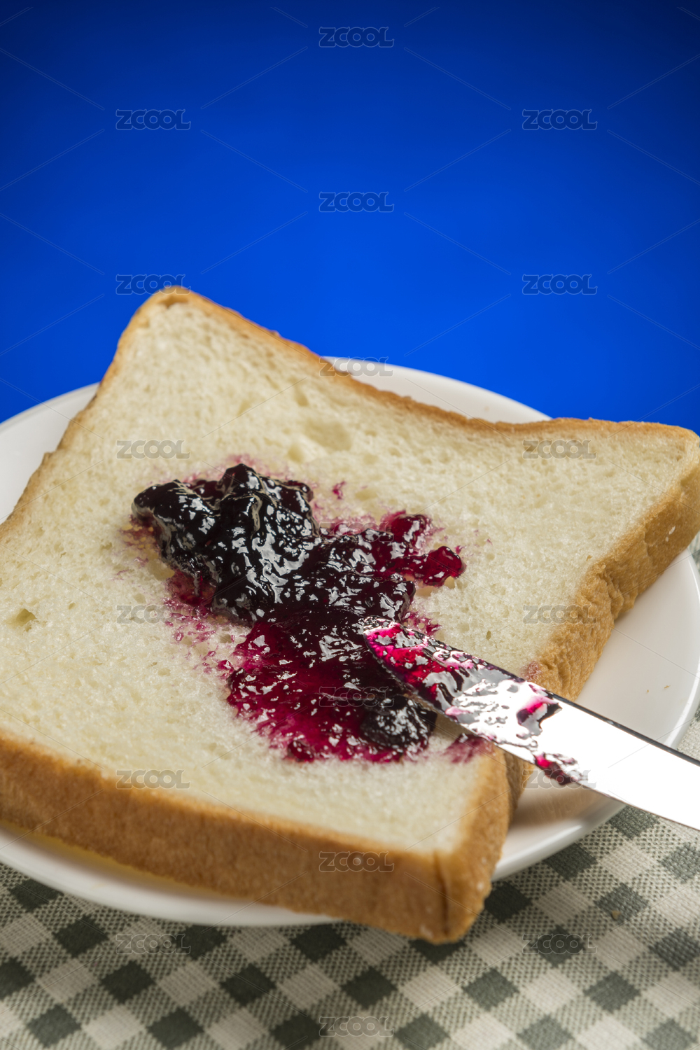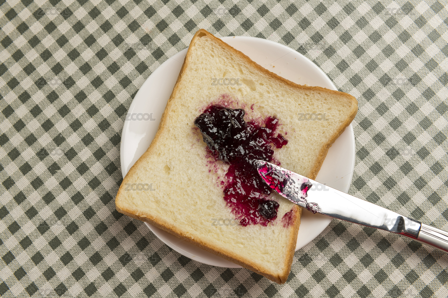 抹著藍莓果醬的面包片擺放在格子桌布上特寫