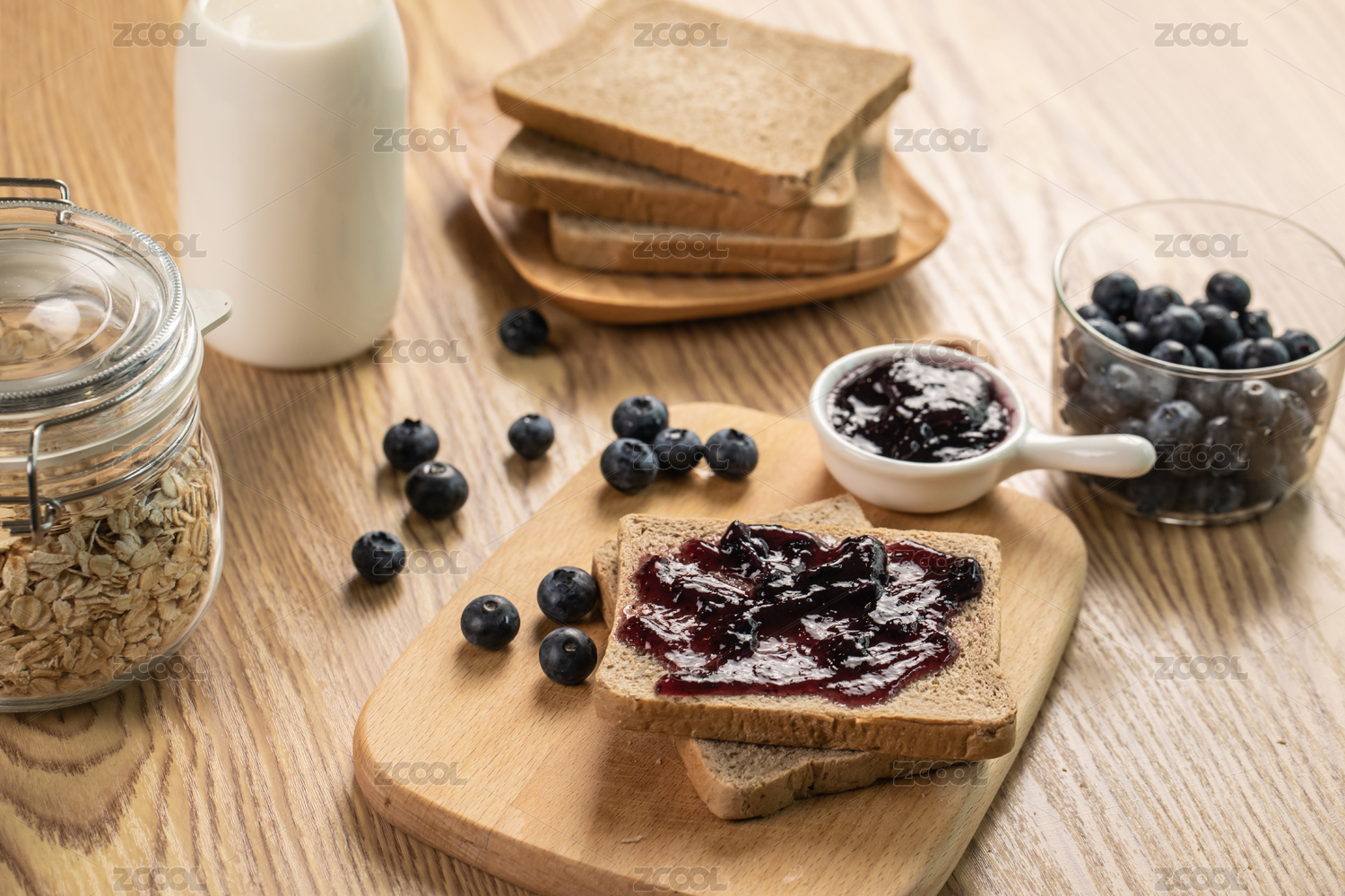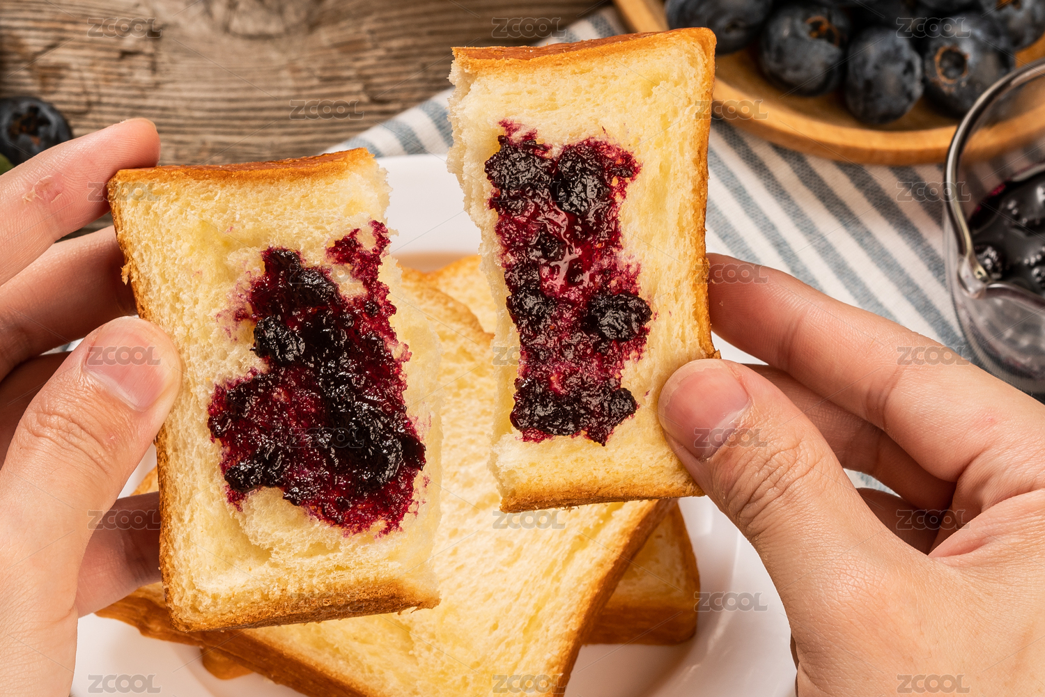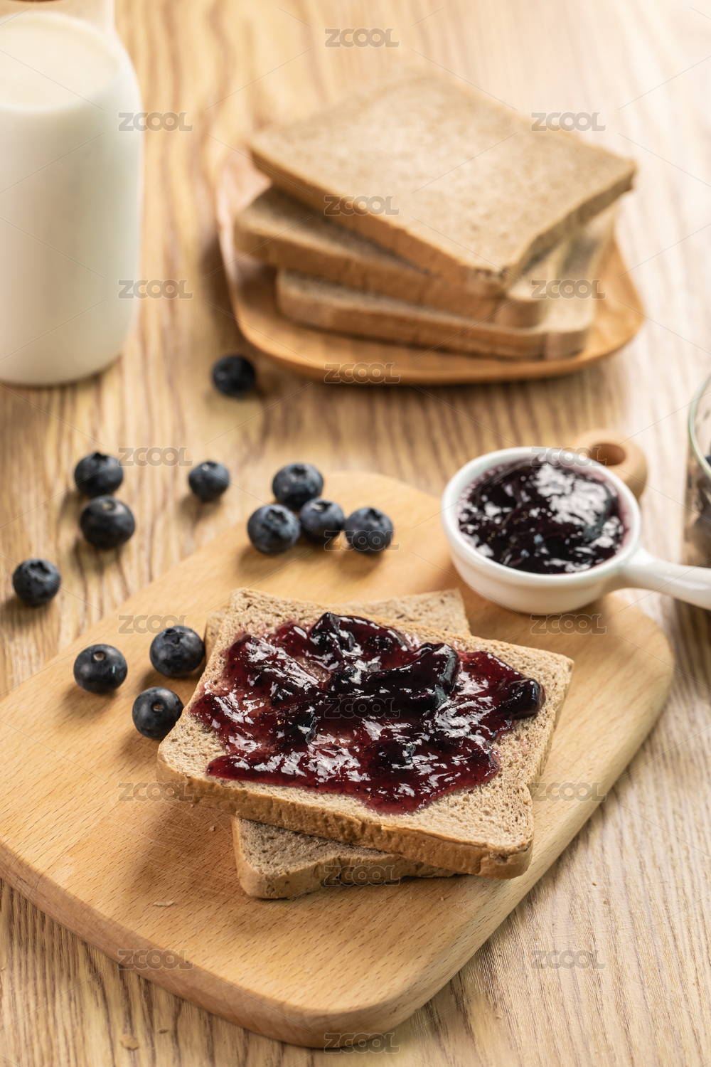 抹著藍莓果醬的面包片擺放在格子桌布上特寫