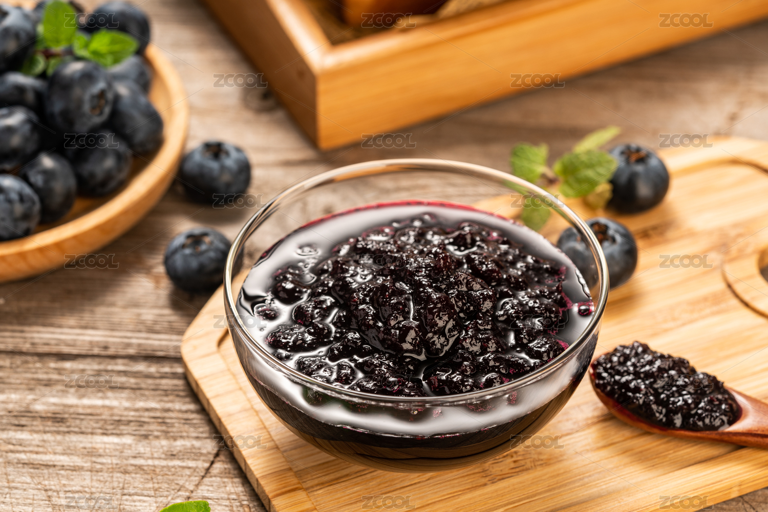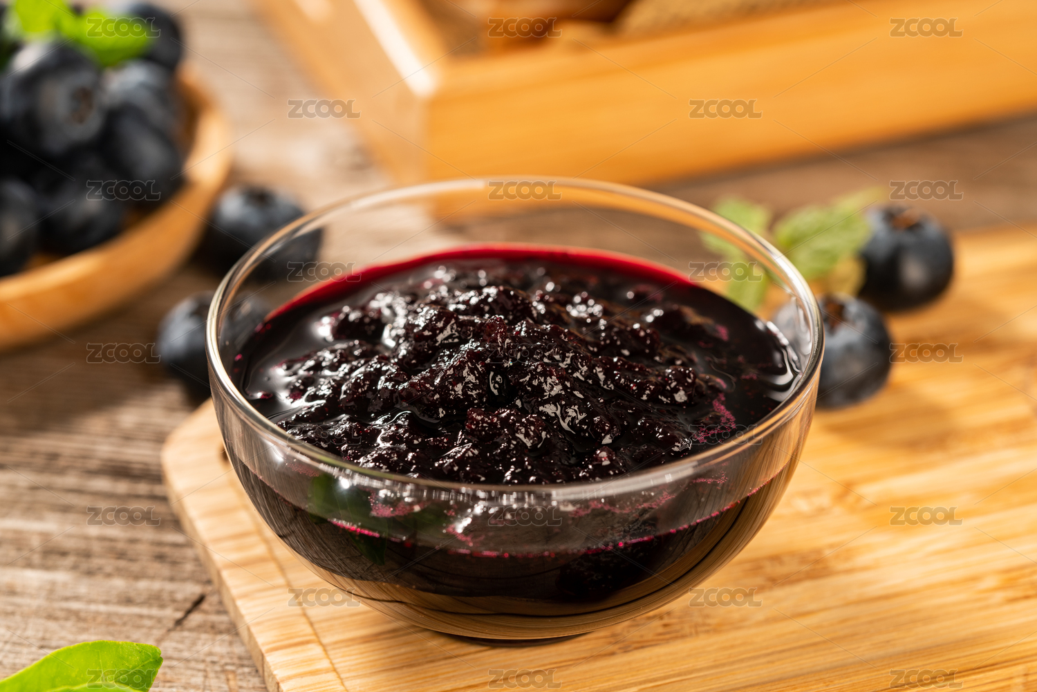 木板背景上一碗藍莓果醬